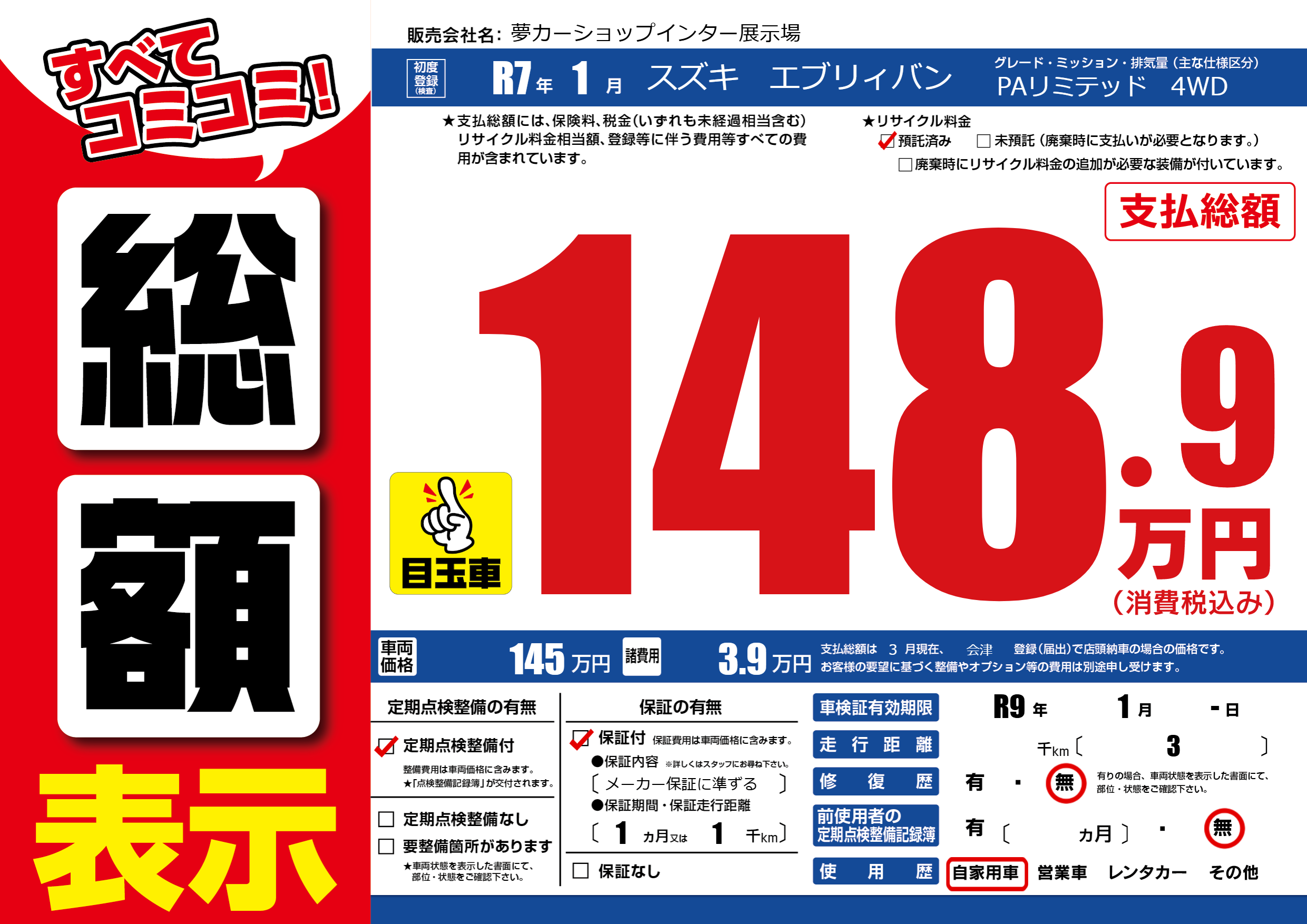 | 車名 | スズキ エブリィバン | グレード ミッション 排気量 |