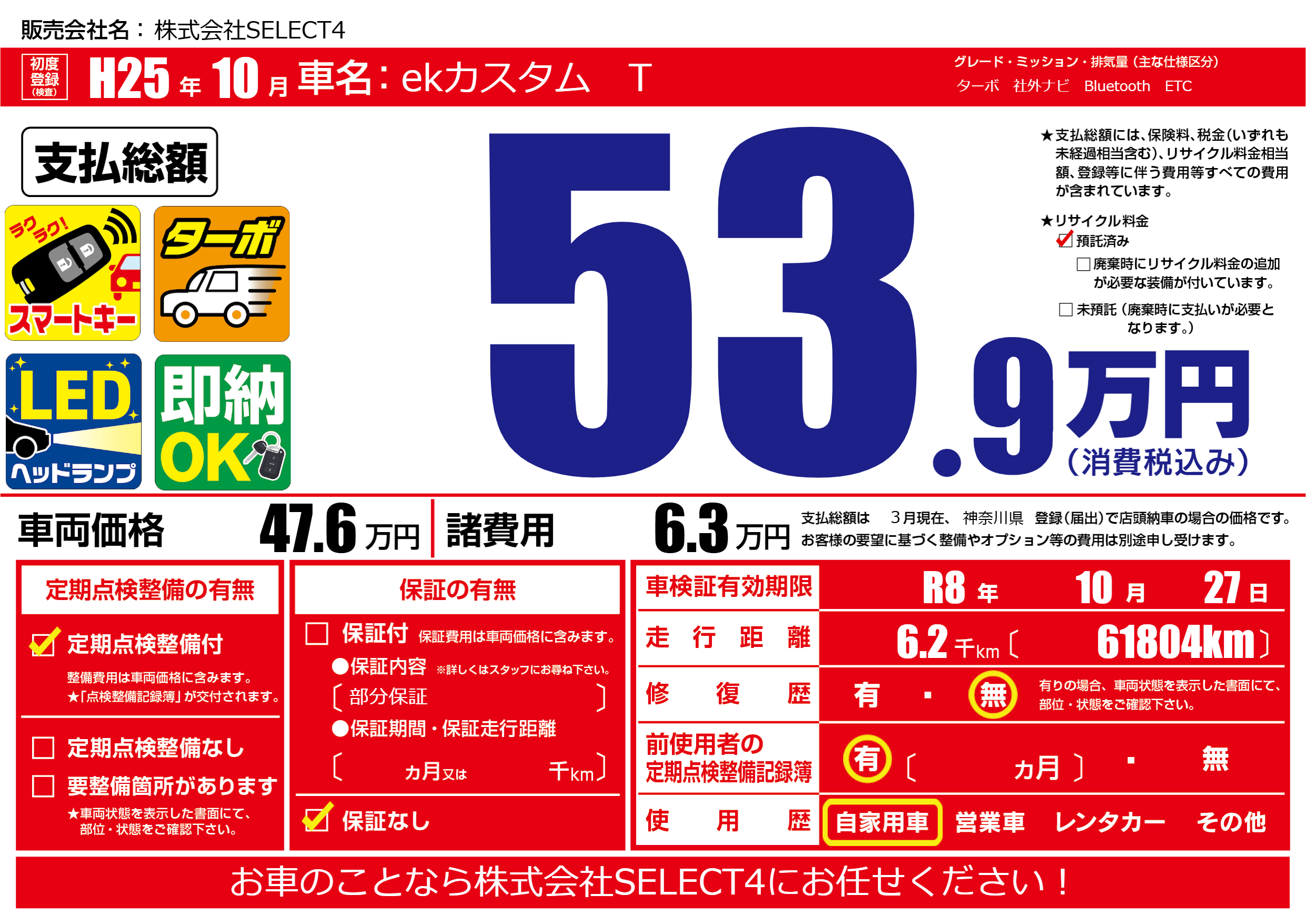 | 車名 | ekカスタム T | グレード ミッション 排気量 |