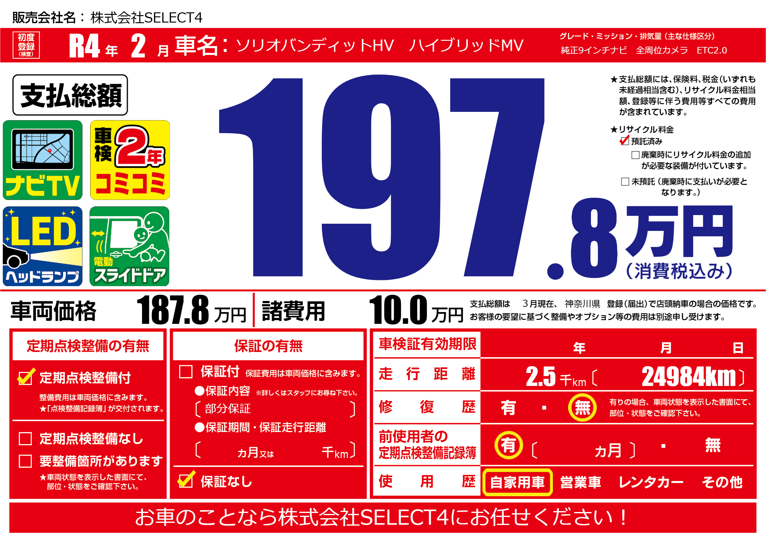 | 車名 | ソリオバンディットHV ハイブリッドMV | グレード ミッション 排気量 |