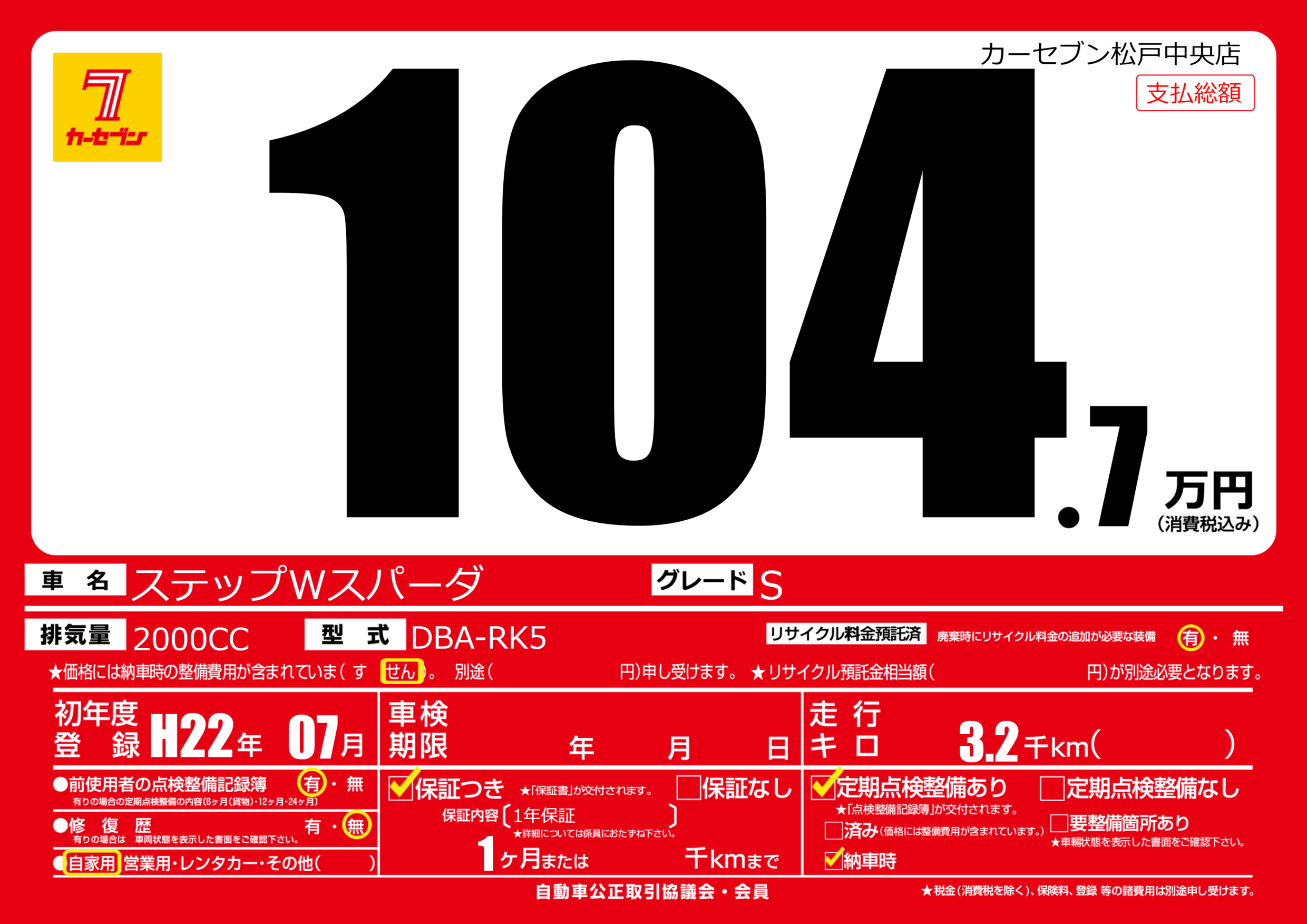 | 走行キロ | 0.3万km | 初年度登録 | H22年07月 |