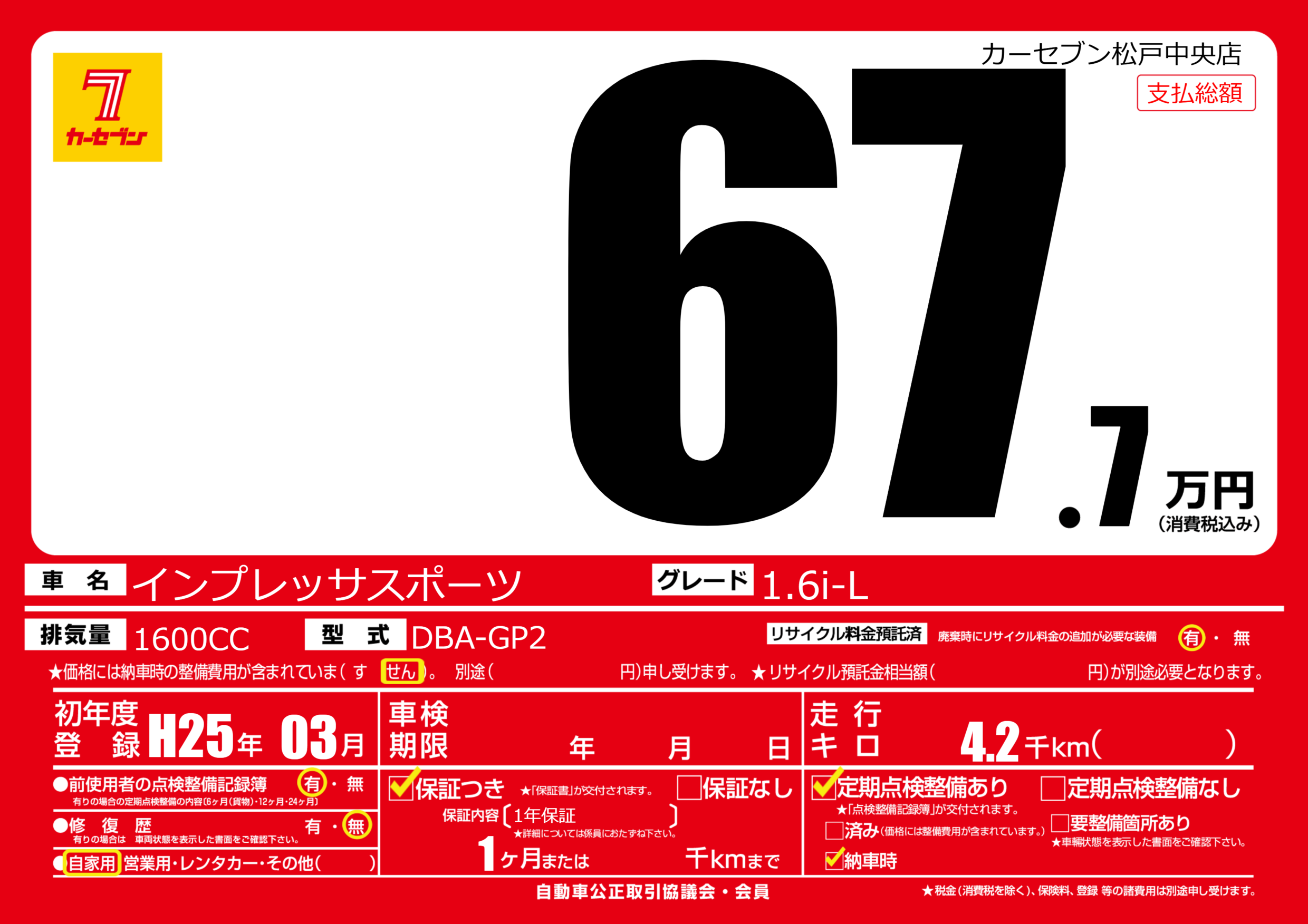 | 車名 | インプレッサスポーツ | グレード ミッション 排気量 |