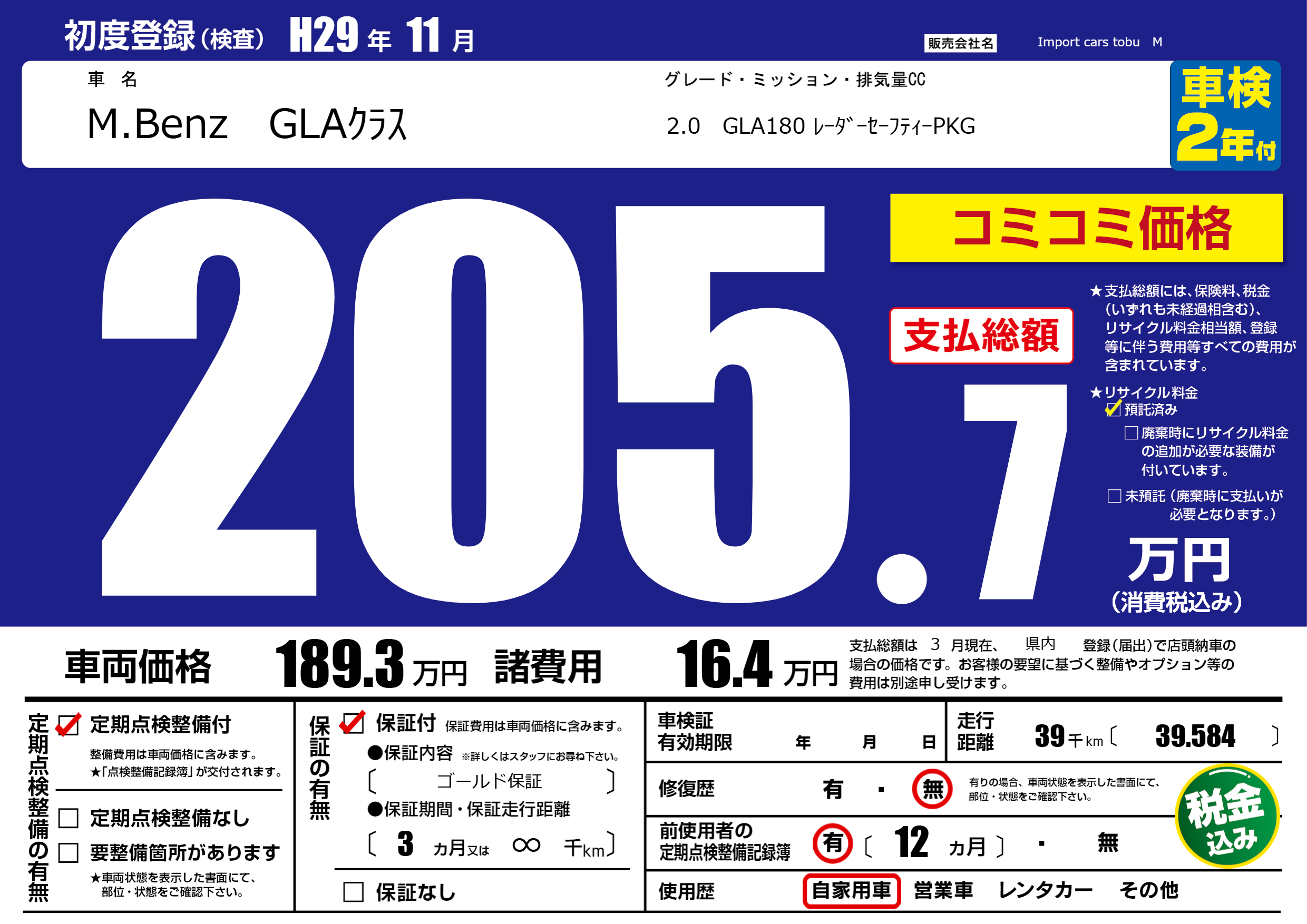 | 車名 | M.Benz GLAクラス | グレード ミッション 排気量 |