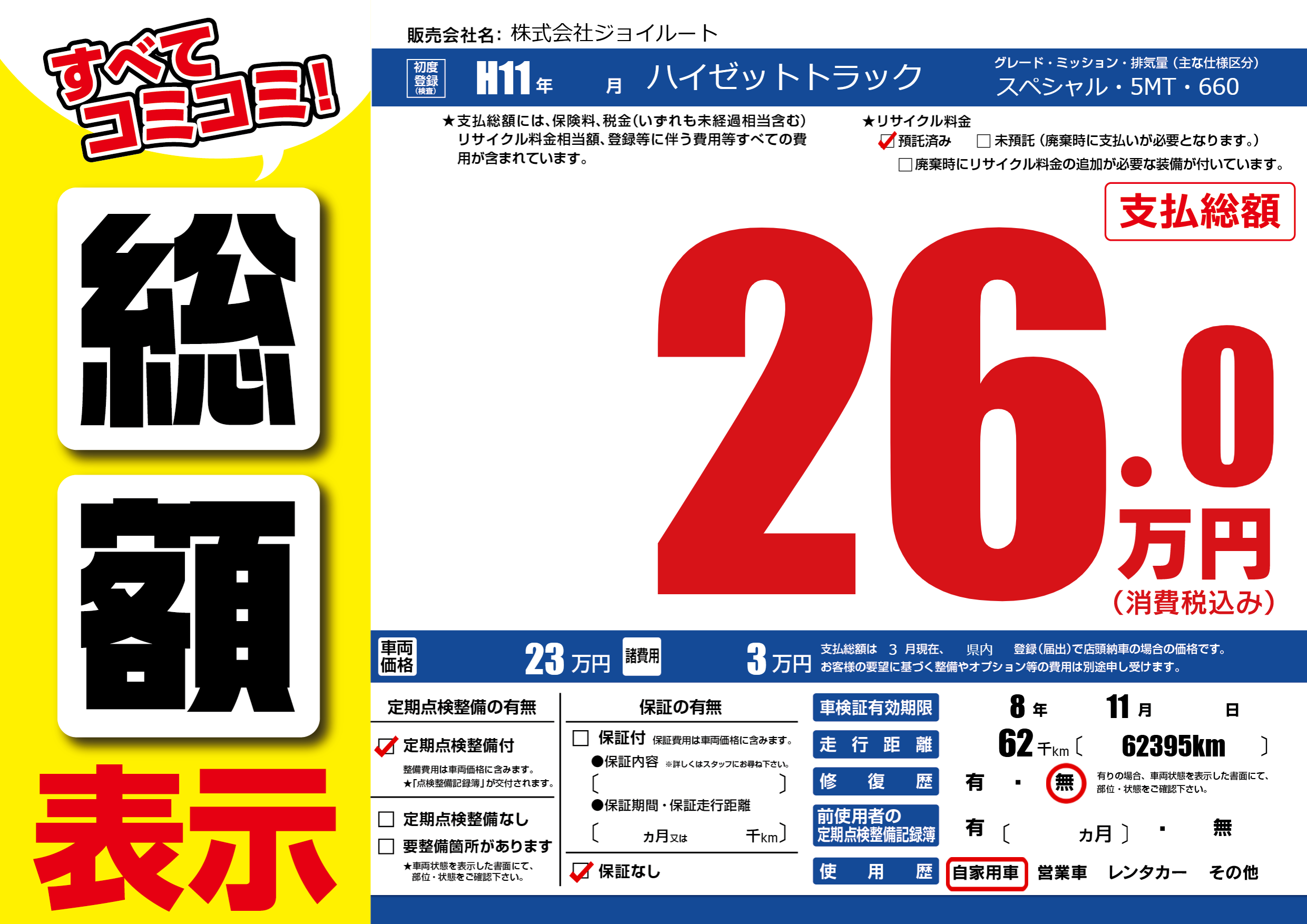 | 車名 | ハイゼットトラック | グレード ミッション 排気量 |