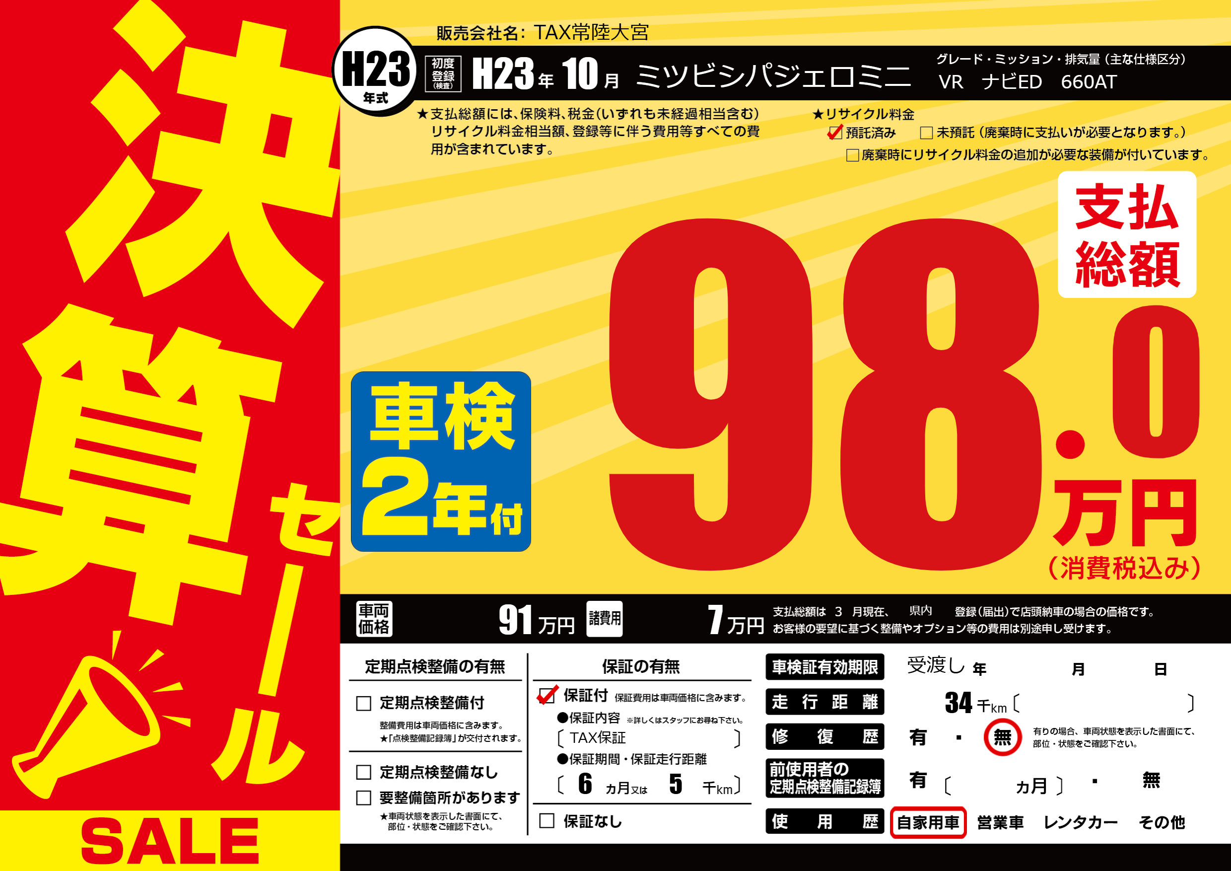 保証付き 保証内容(TAX保証) 6ヶ月または(5)千kmまで |