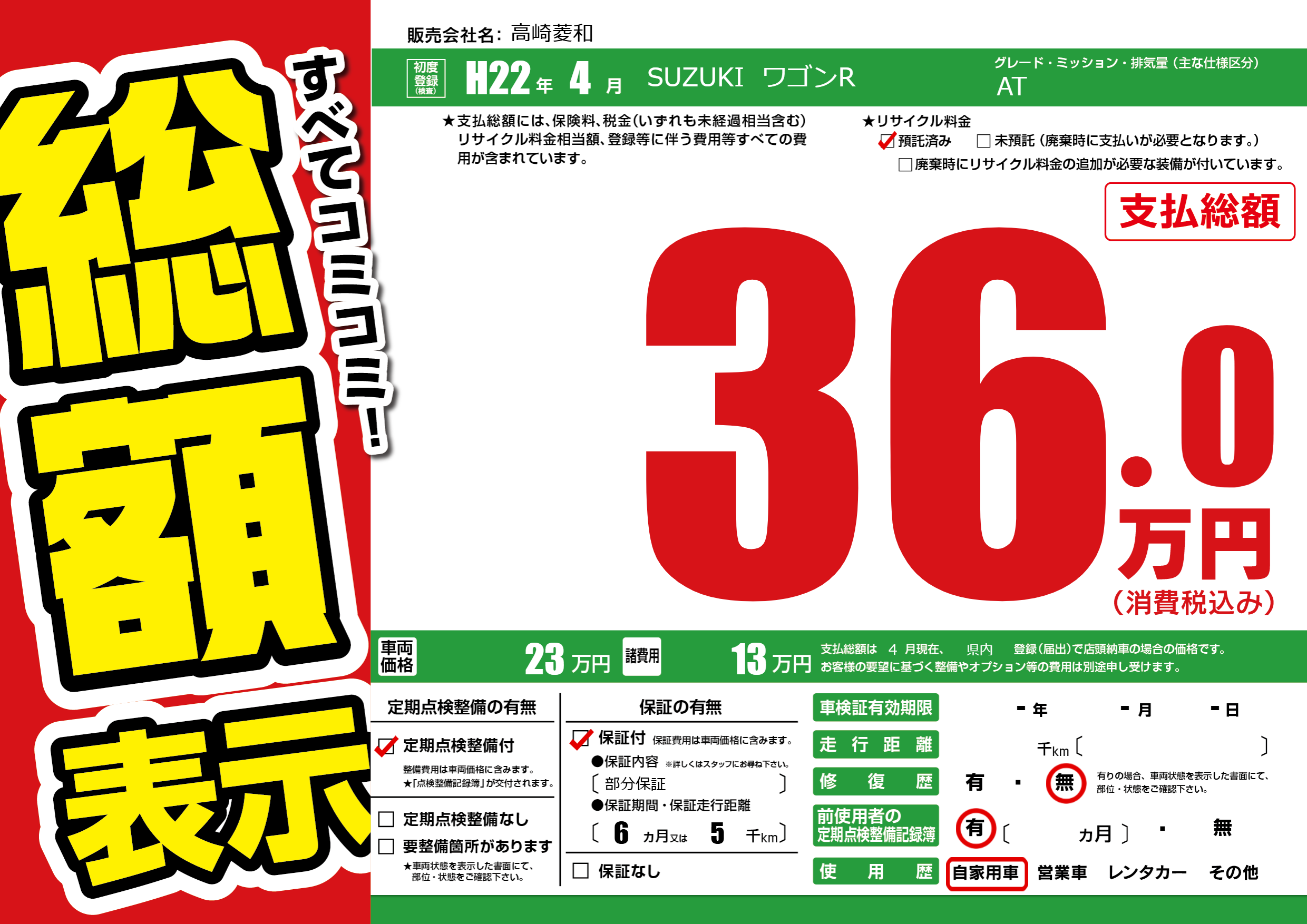 | 車名 | SUZUKI ワゴンR | グレード ミッション 排気量 |