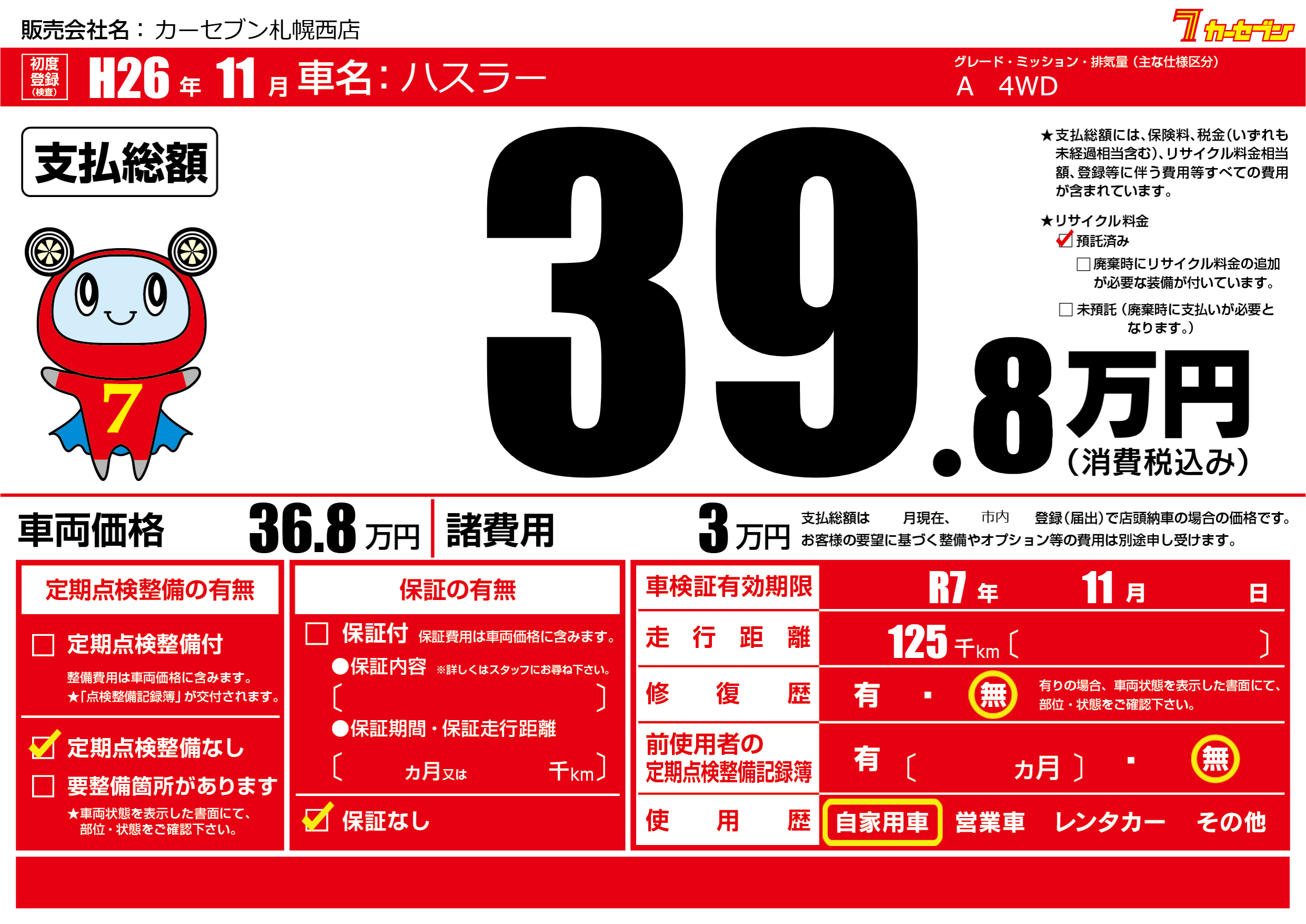 | 走行キロ | 12.5万km | 初年度登録 | H26年11月 |