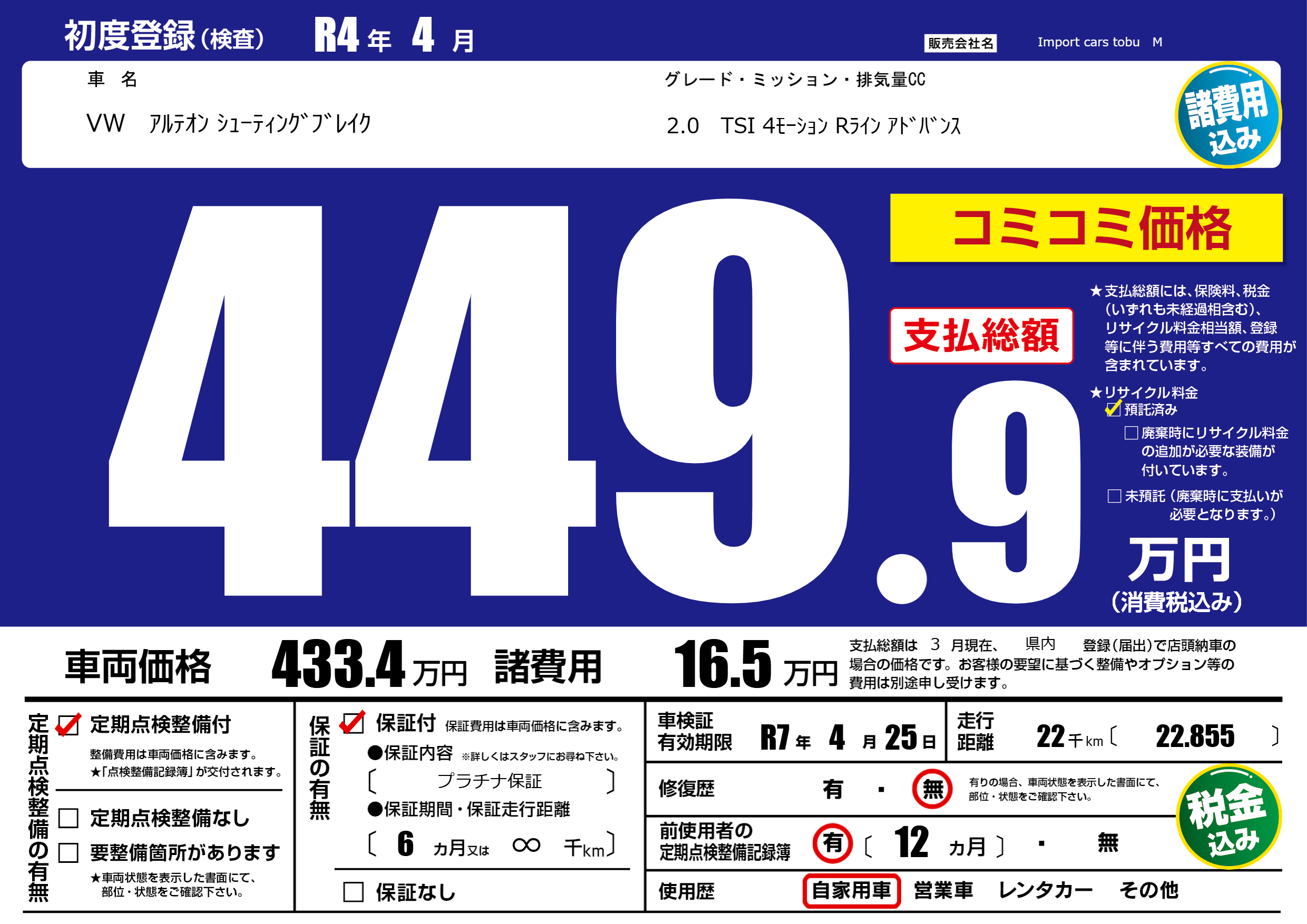 | 車名 | VW アルテオン シューティングブレイク | グレード ミッション 排気量 |