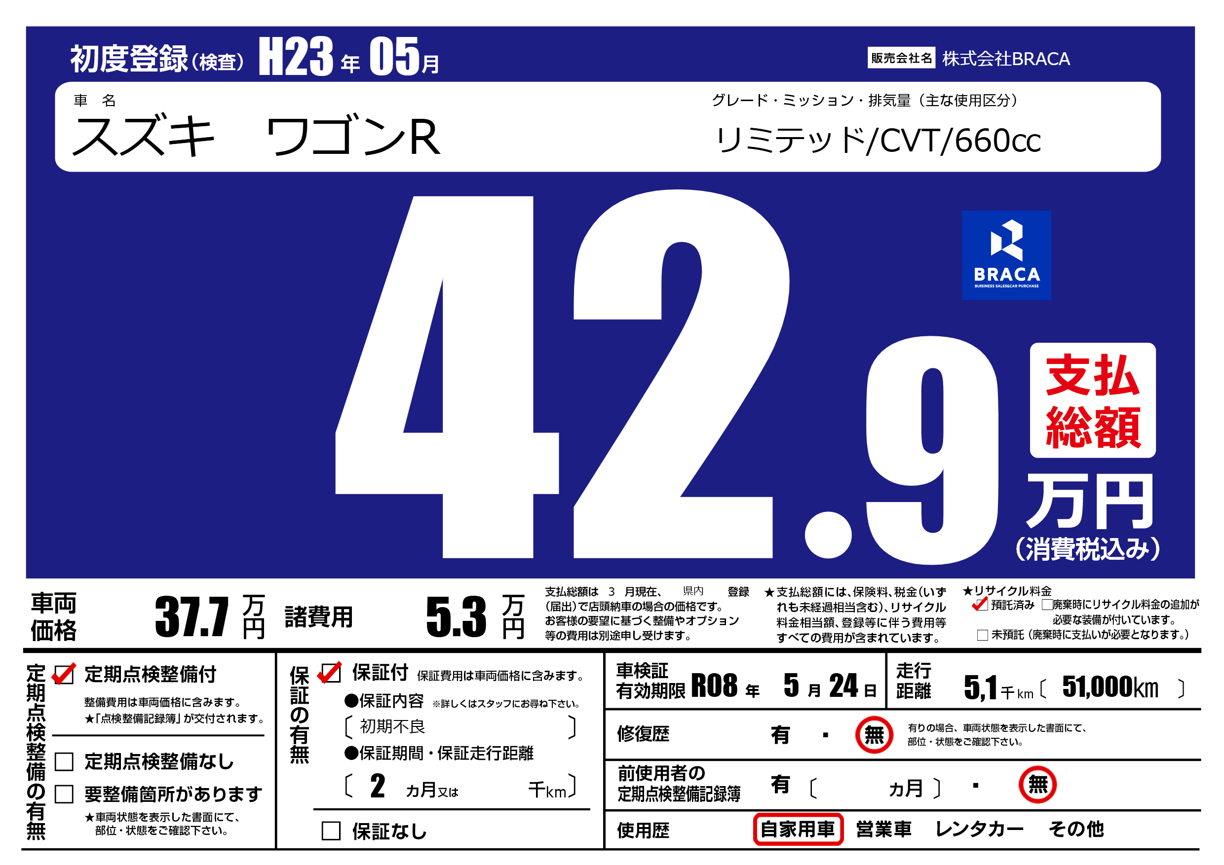 | 走行キロ | 0.5万km | 初年度登録 | H23年05月 |