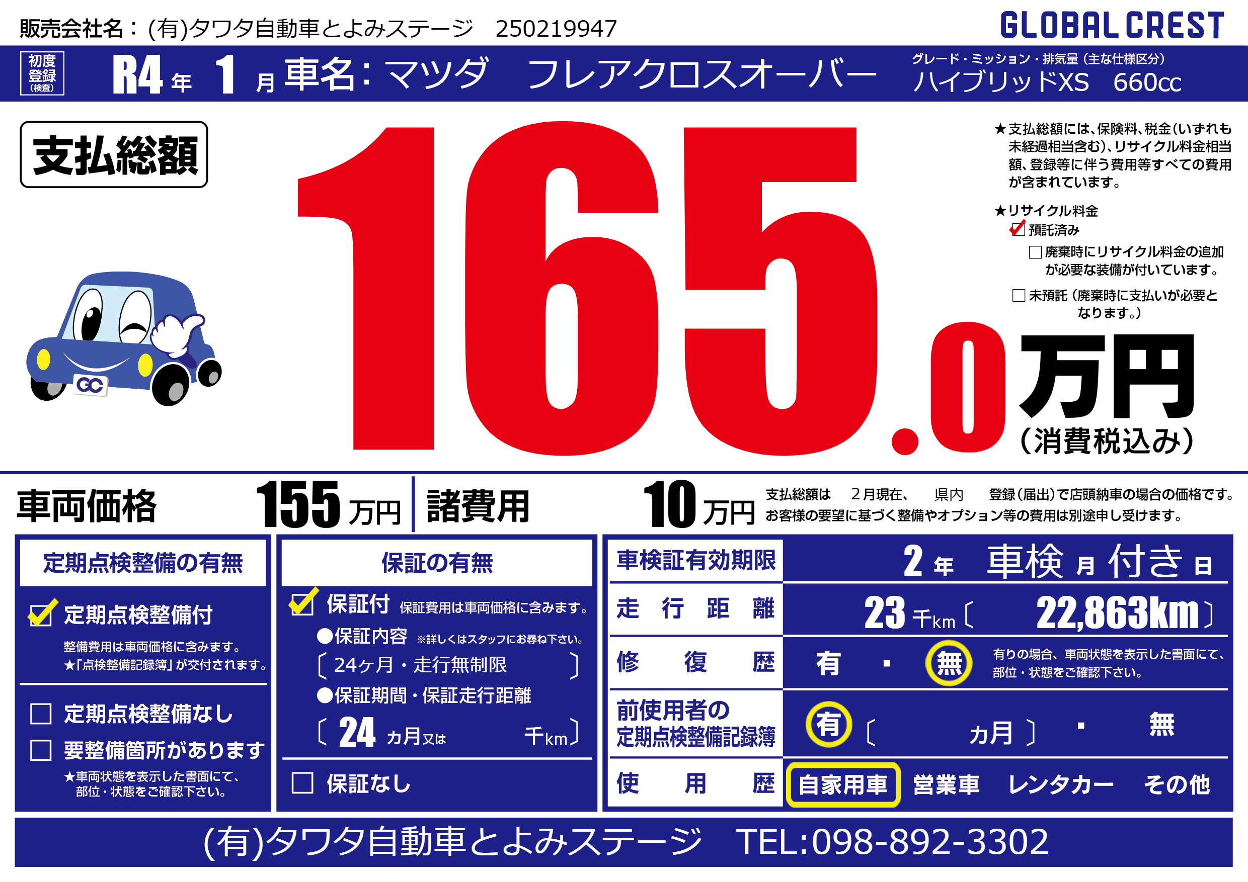 | 車名 | マツダ フレアクロスオーバー | グレード ミッション 排気量 |