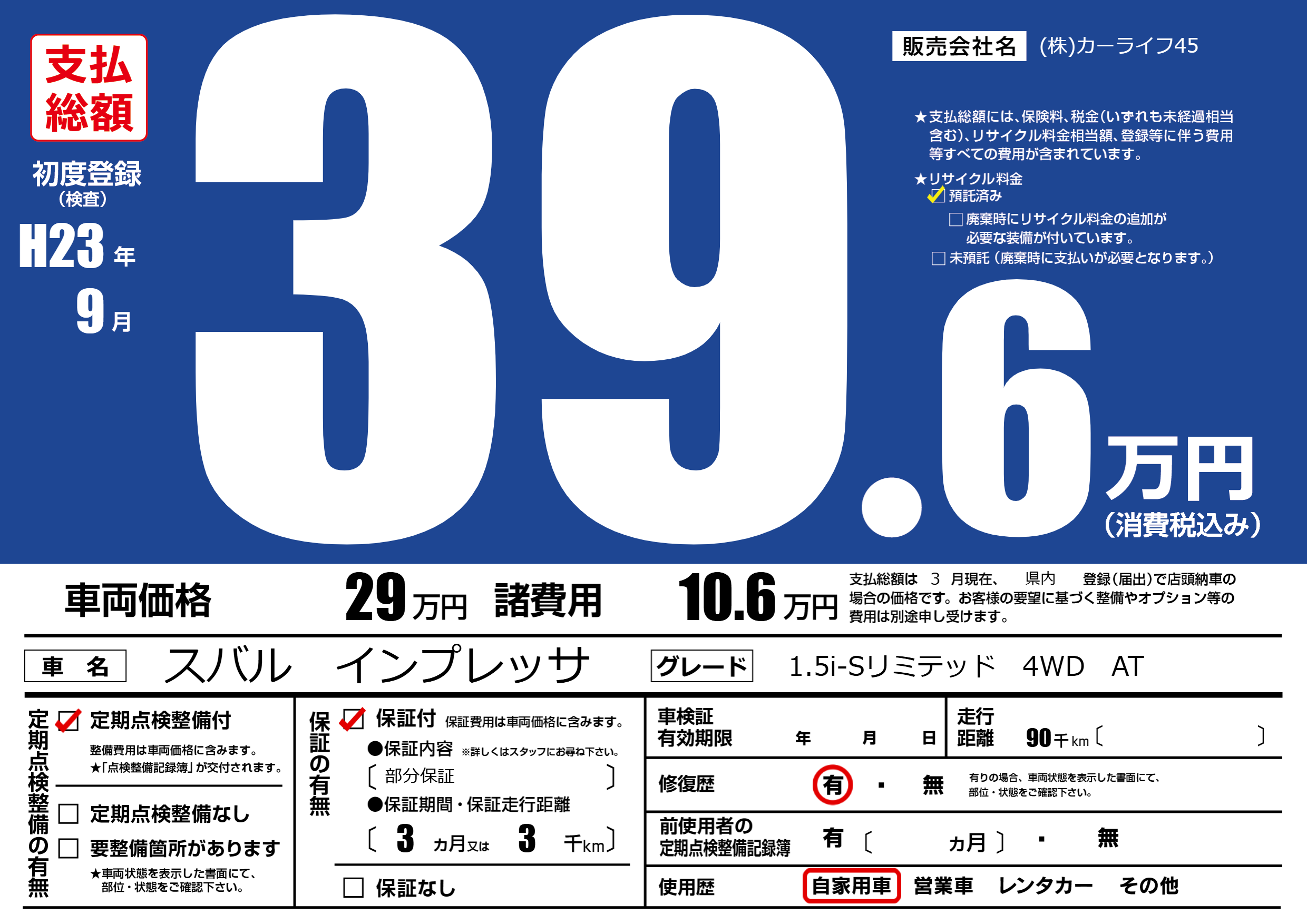 | 車名 | スバル インプレッサ | グレード ミッション 排気量 |