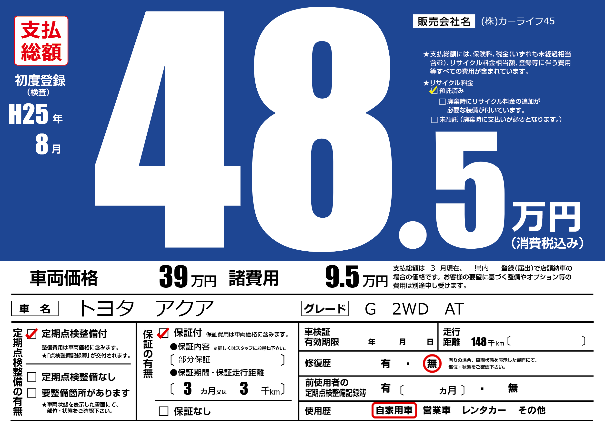 | 走行キロ | 14.8万km | 初年度登録 | H25年8月 |
