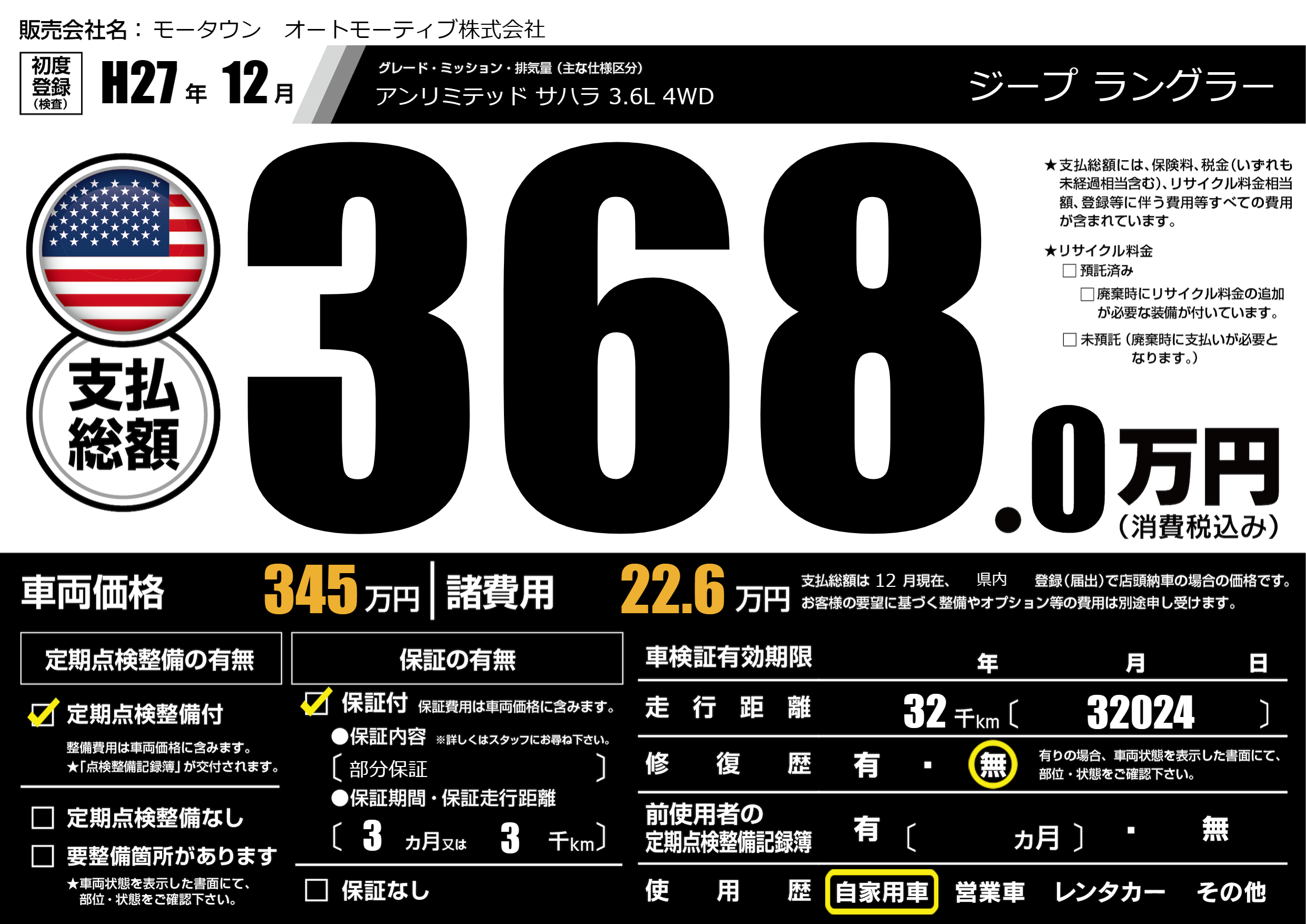 | 車名 | ジープ ラングラー | グレード ミッション 排気量 |