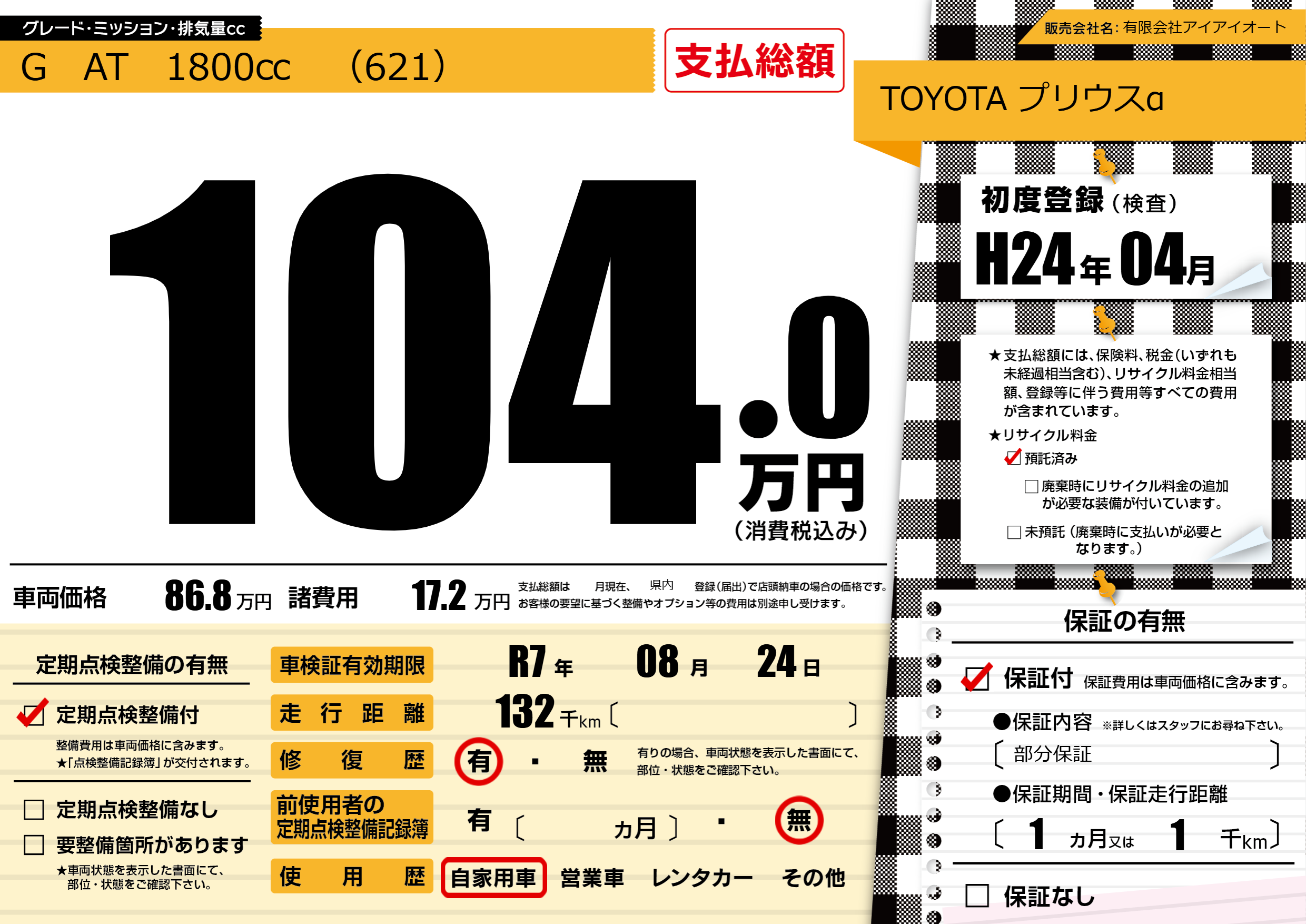 | 車名 | TOYOTA プリウスα | グレード ミッション 排気量 |