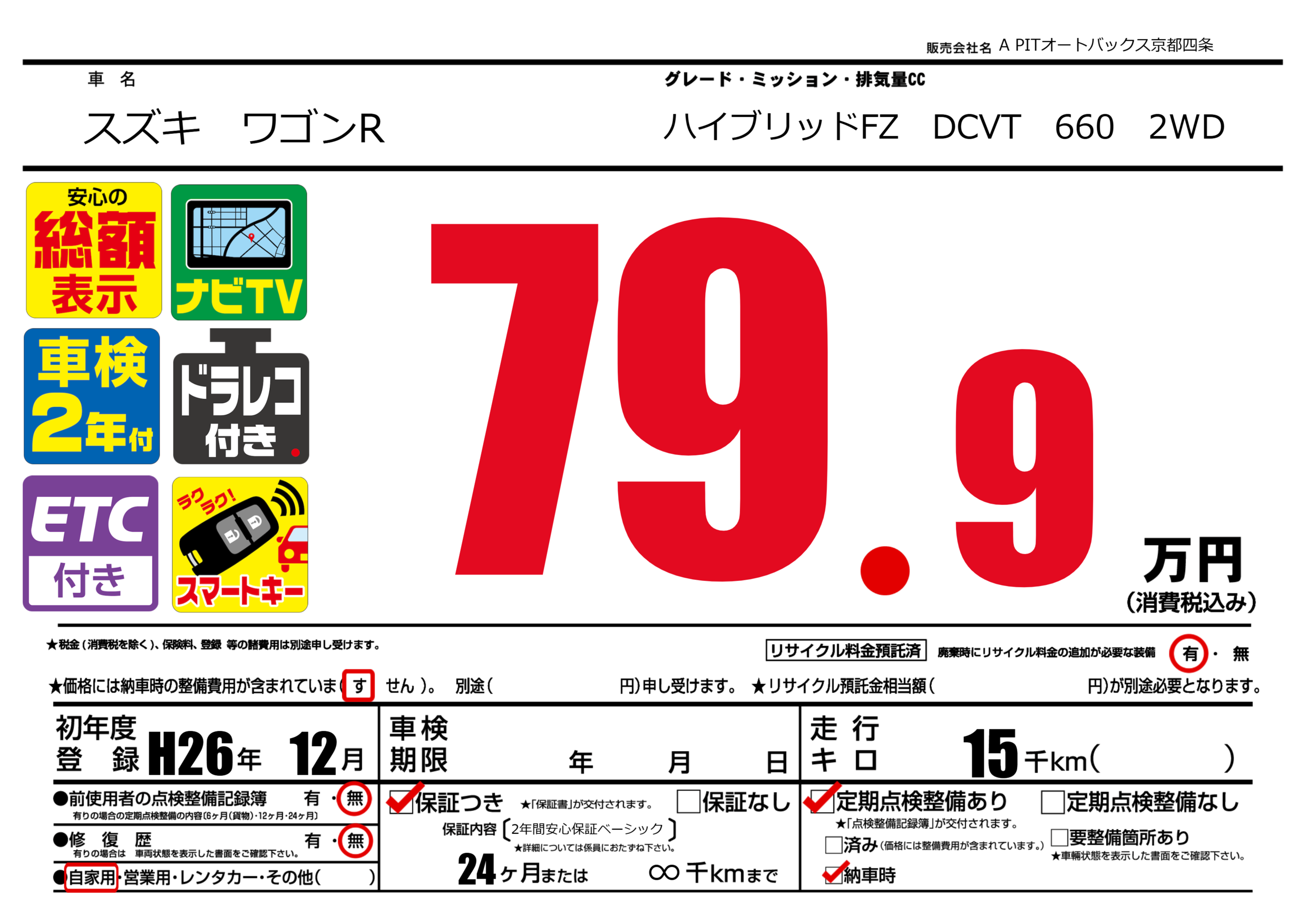 保証なし 保証内容(2年間安心保証ベーシック) 24ヶ月または(∞)千kmまで |