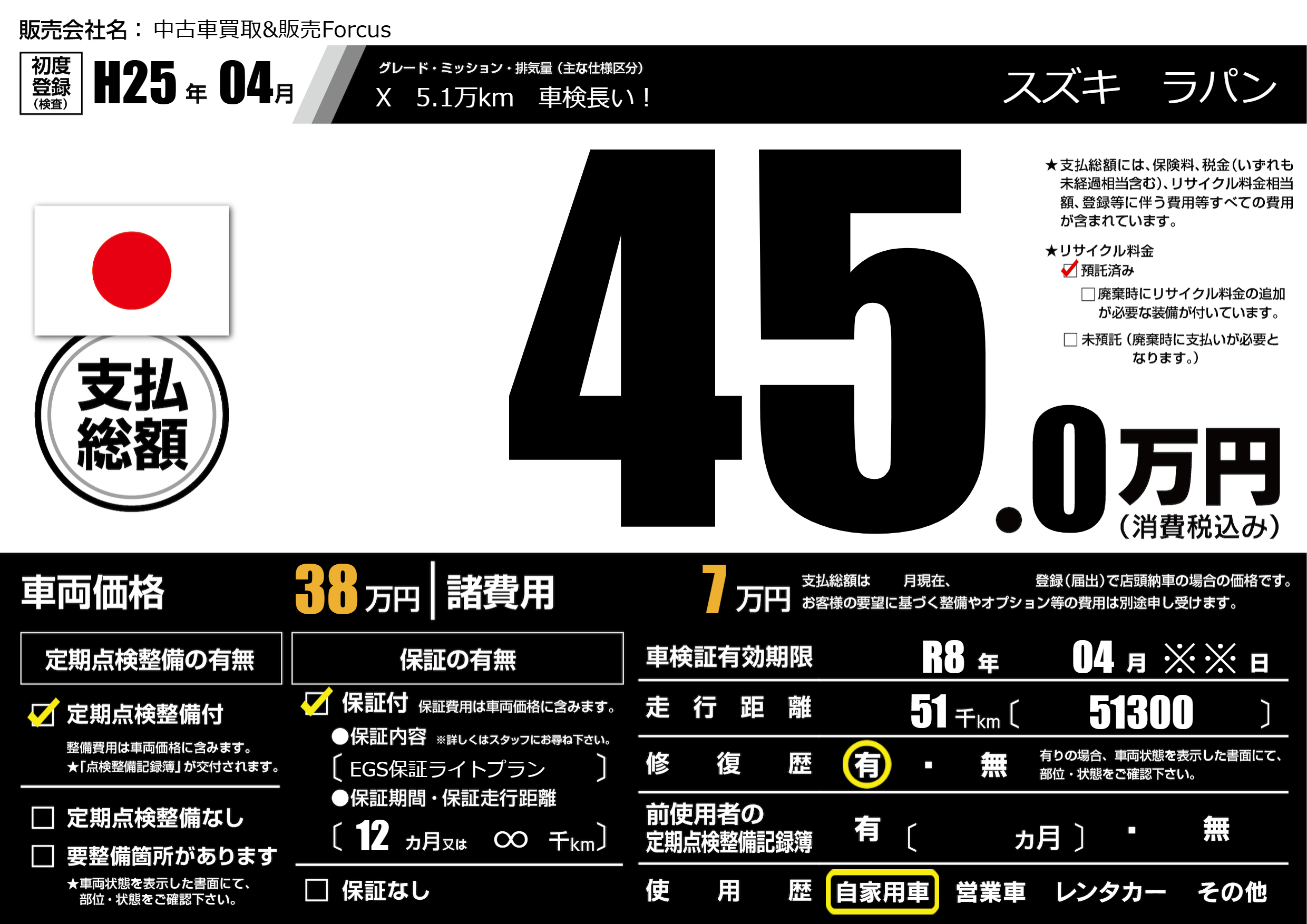 | 走行キロ | 5.1万km | 初年度登録 | H25年04月 |