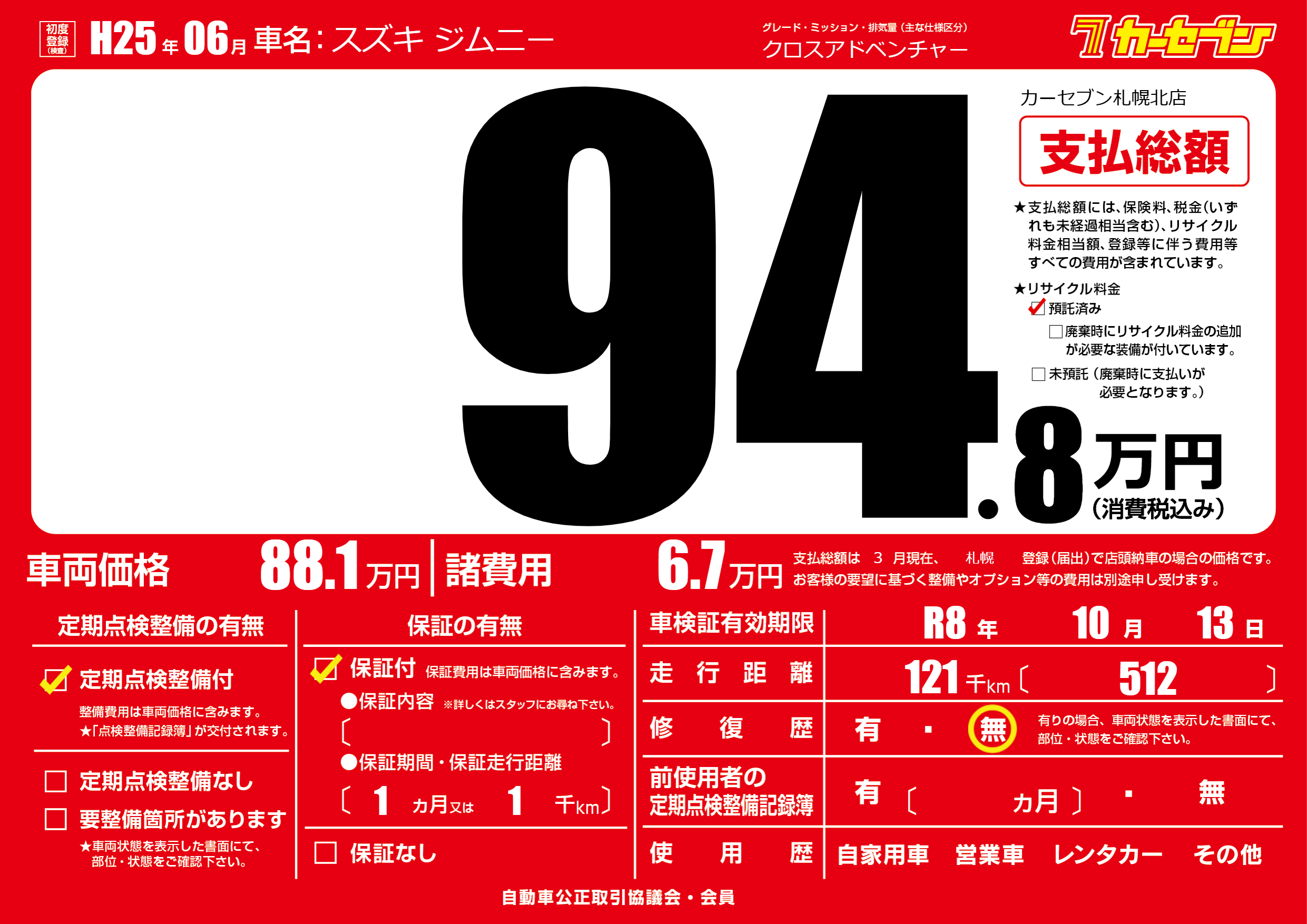 | 走行キロ | 12.1万km | 初年度登録 | H25年06月 |