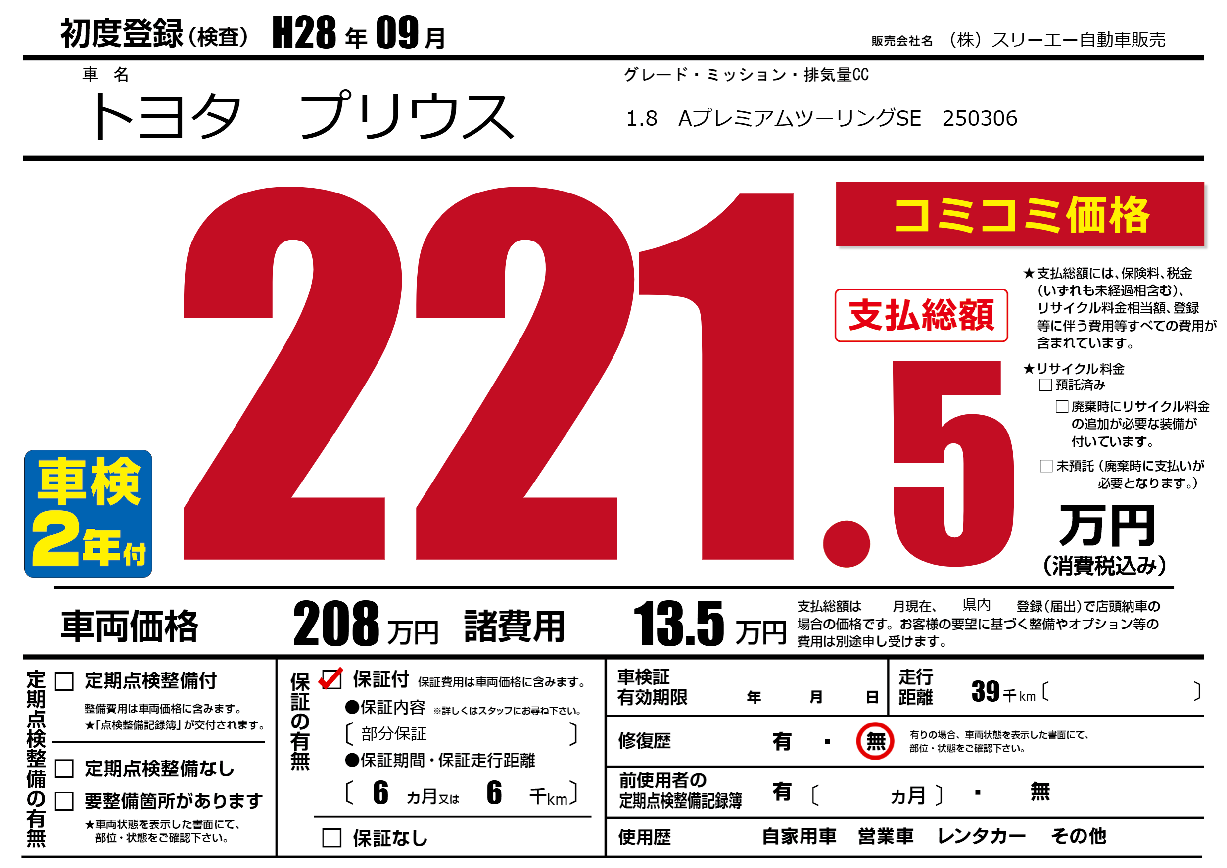 保証付き 保証内容(部分保証) 6ヶ月または(6)千kmまで |