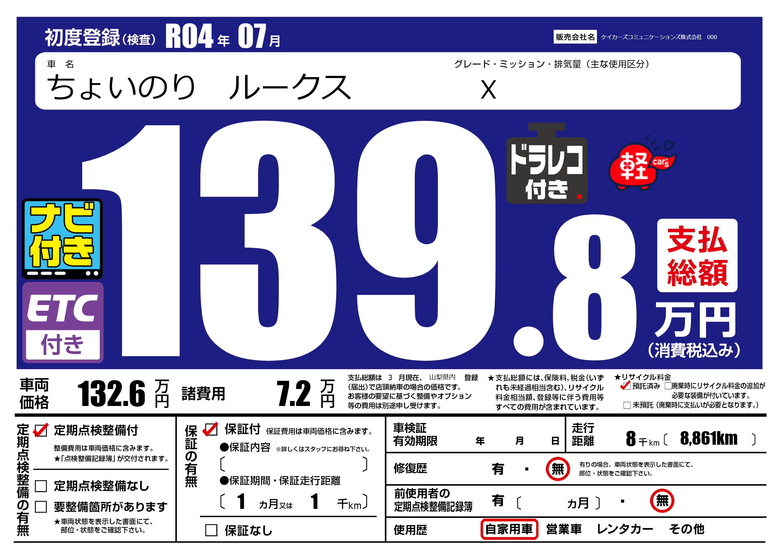 | 走行キロ | 0.8万km | 初年度登録 | R04年07月 |