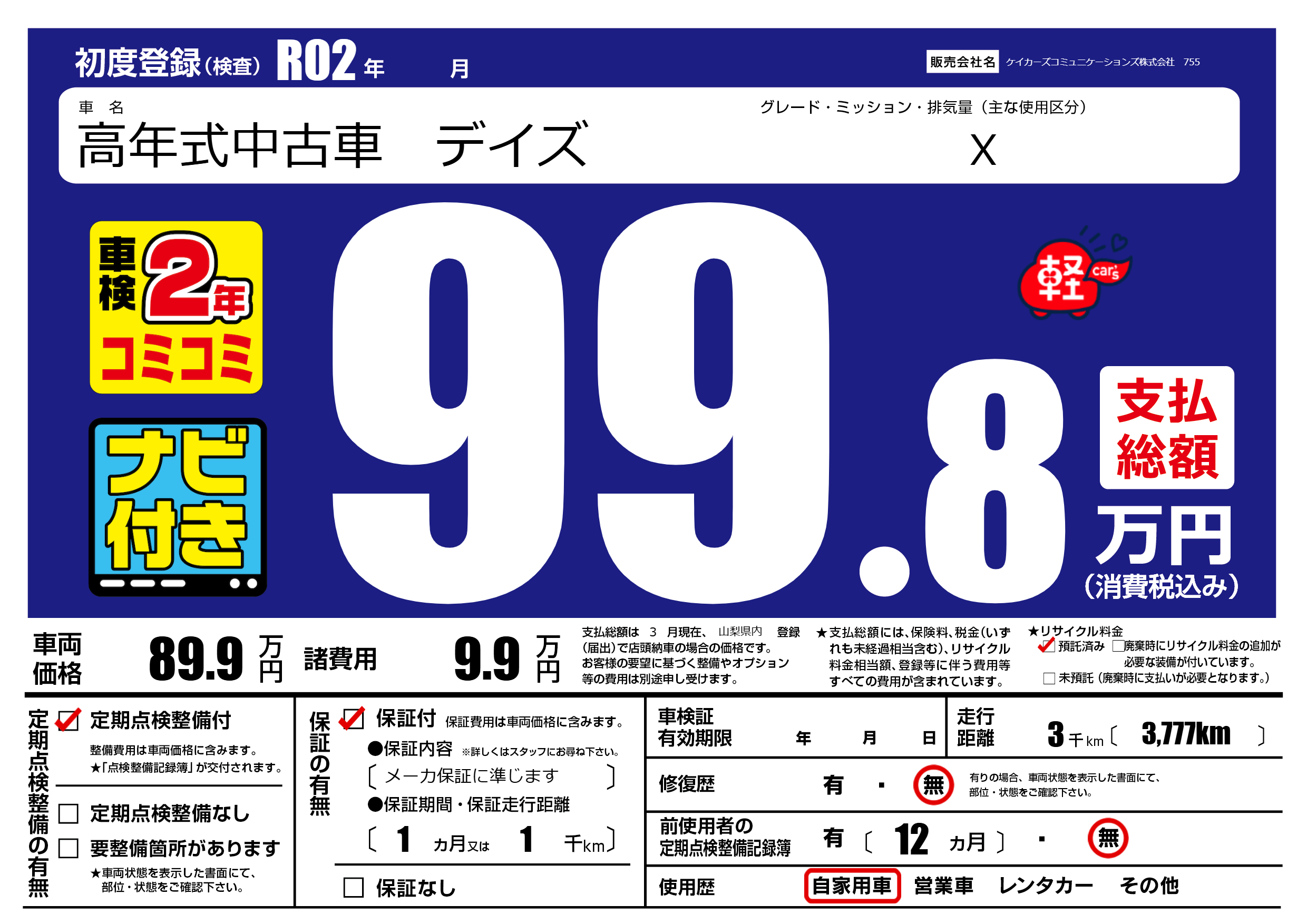 | 車名 | 高年式中古車 デイズ | グレード ミッション 排気量 |