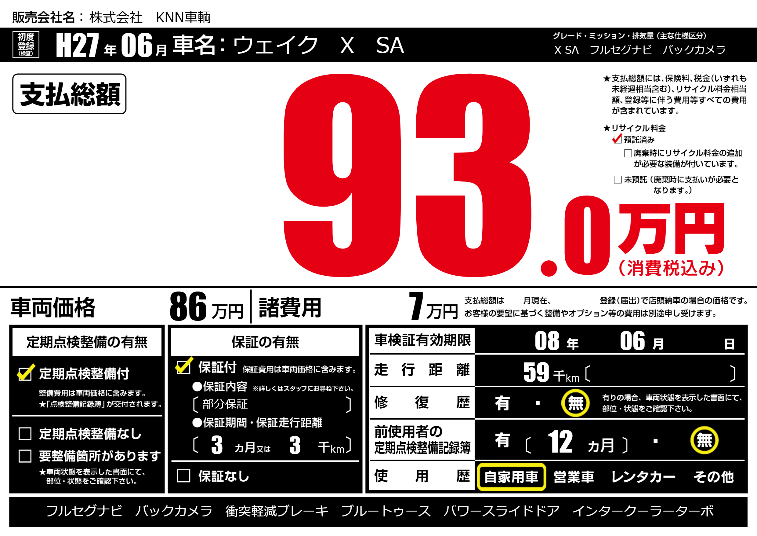 | 車名 | ウェイク X SA | グレード ミッション 排気量 |