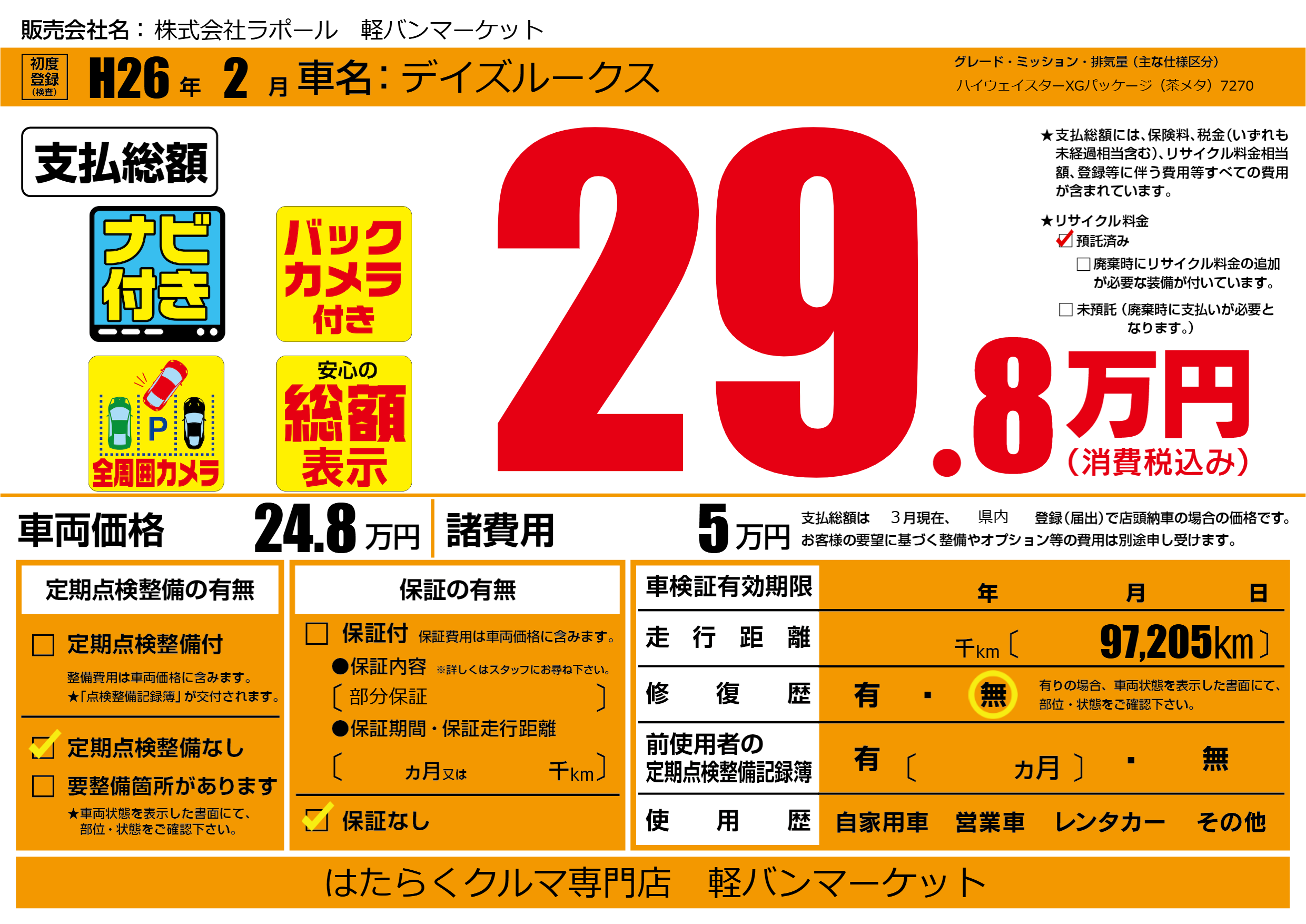 | 走行キロ | - | 初年度登録 | H26年2月 |