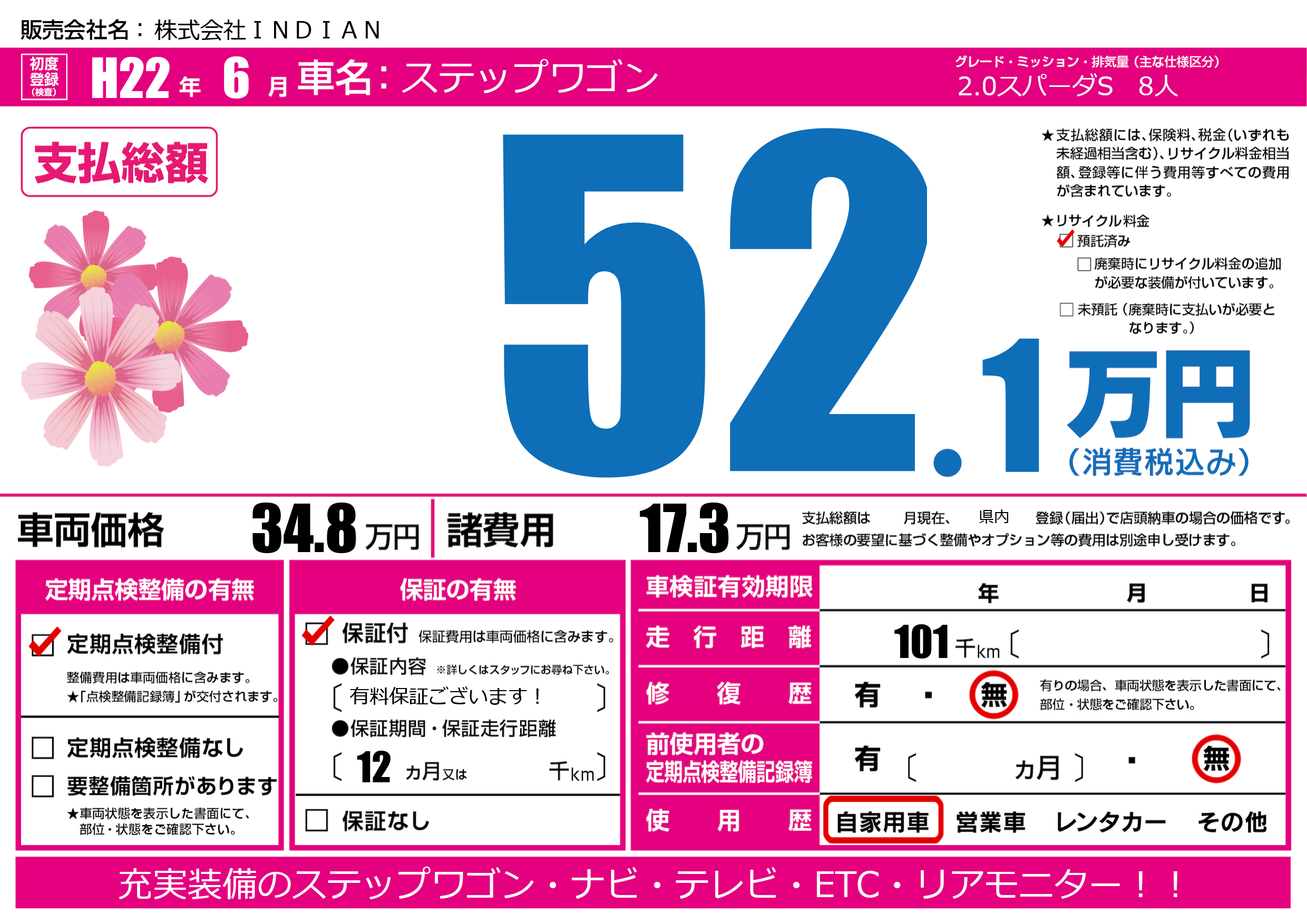| 車名 | ステップワゴン | グレード ミッション 排気量 |