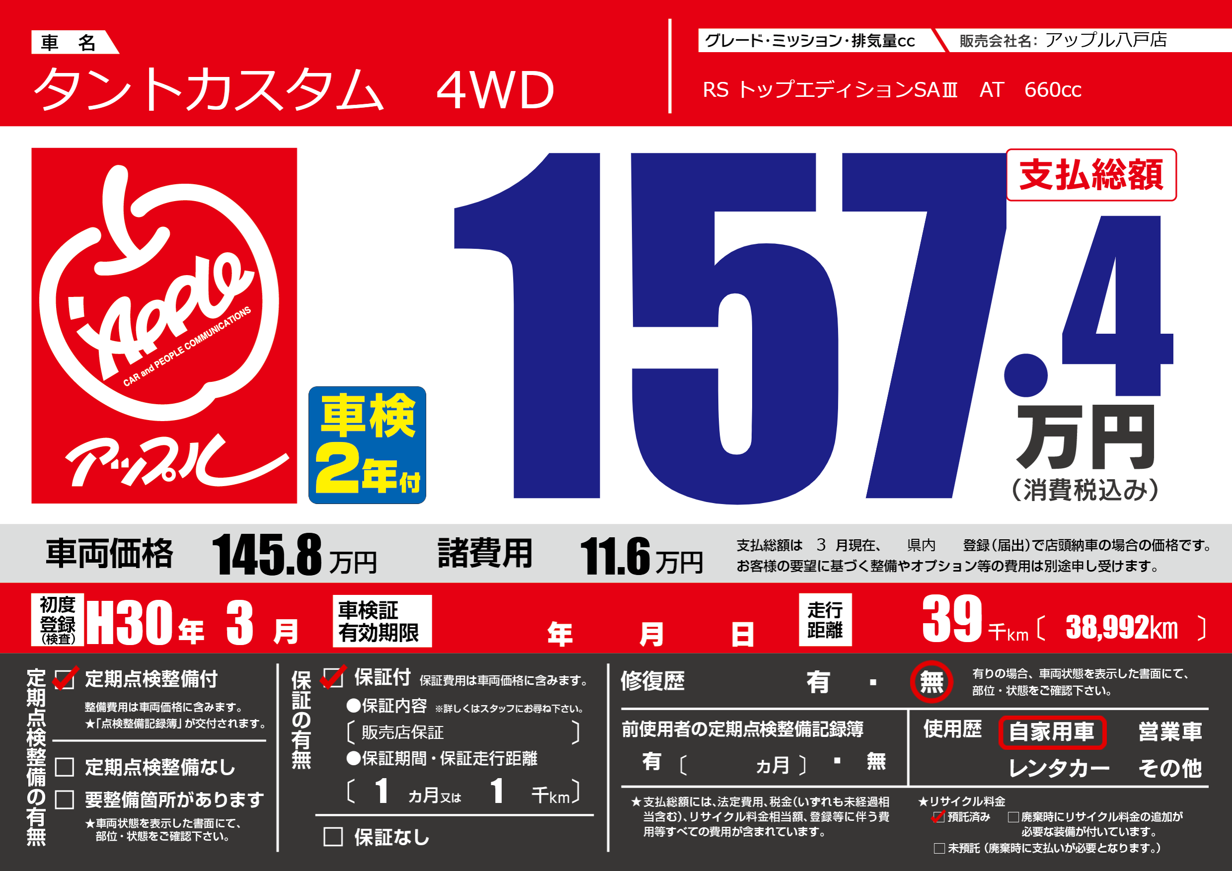 | 走行キロ | 3.9万km | 初年度登録 | H30年3月 |