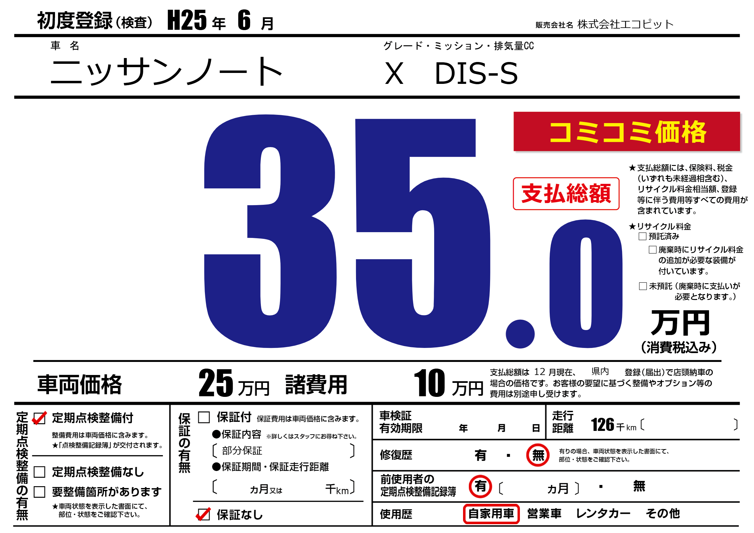 | 車名 | ニッサンノート | グレード ミッション 排気量 |