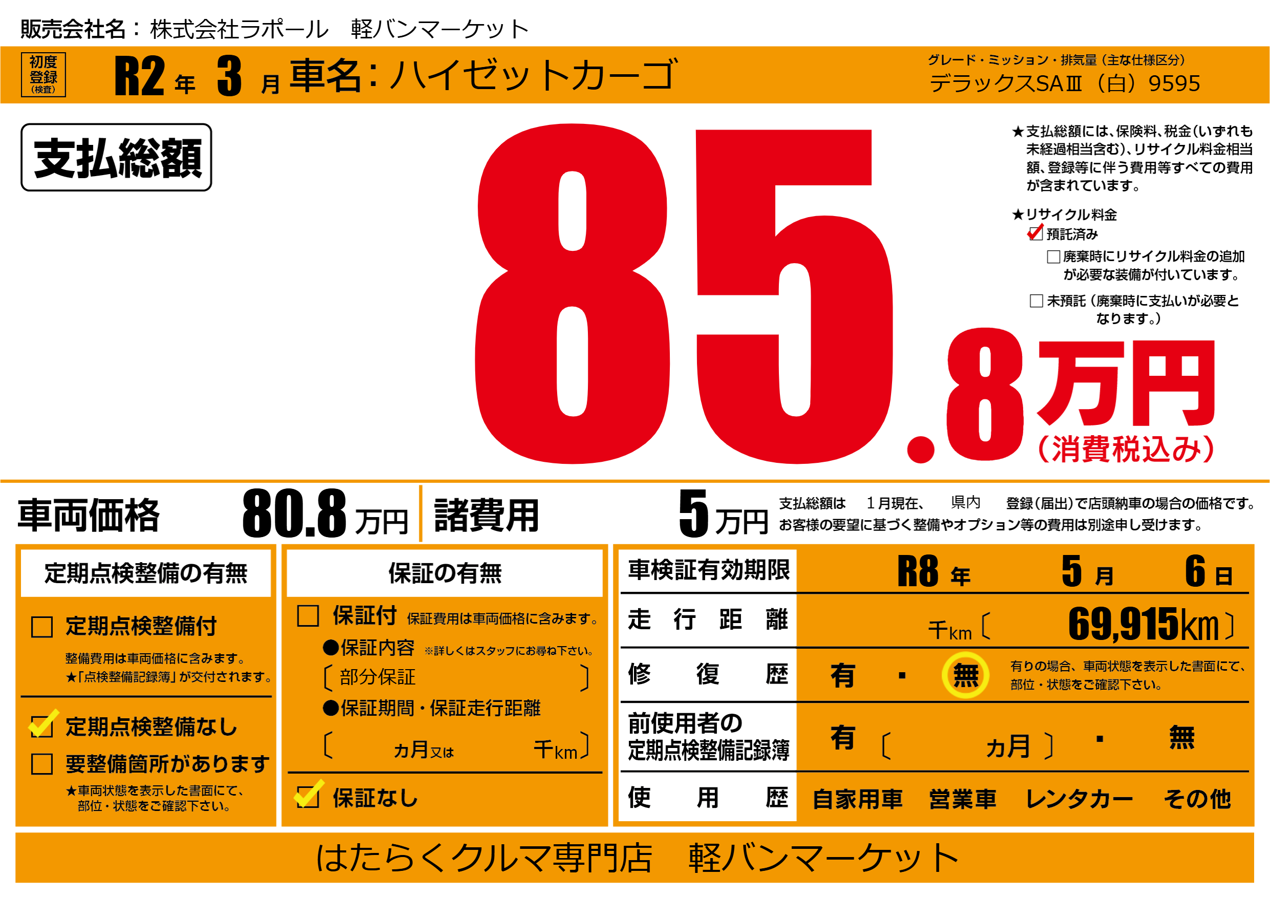 | 車名 | ハイゼットカーゴ | グレード ミッション 排気量 |