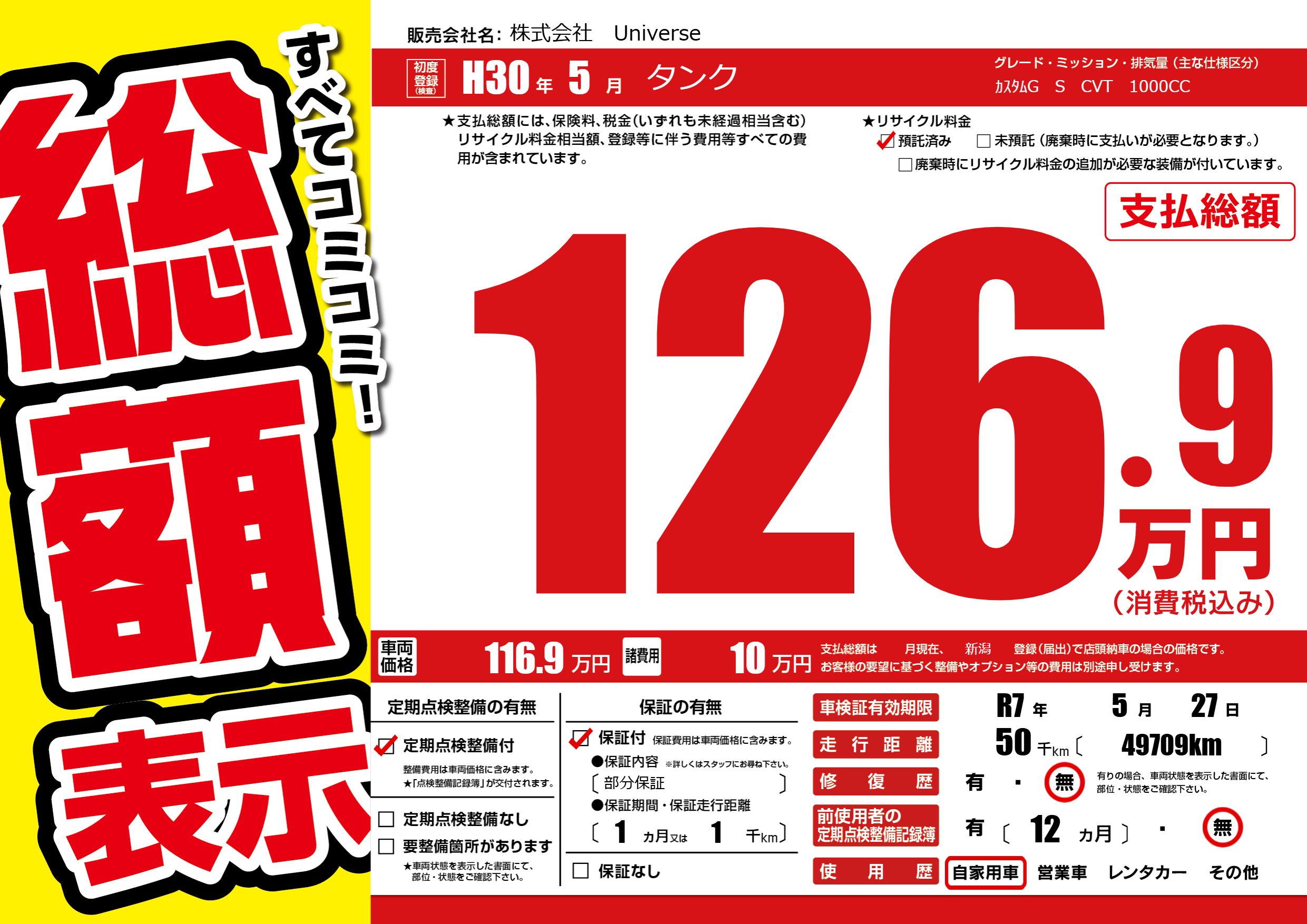 | 走行キロ | 5万km | 初年度登録 | H30年5月 |
