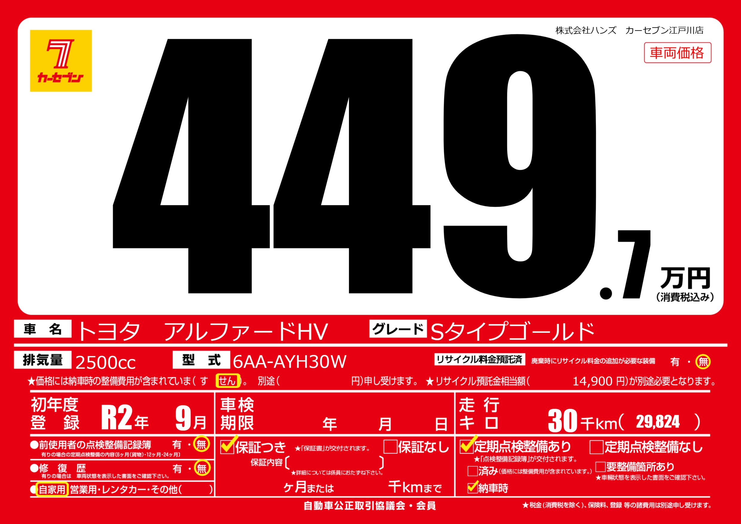 | 車名 | トヨタ アルファードHV | グレード ミッション 排気量 |