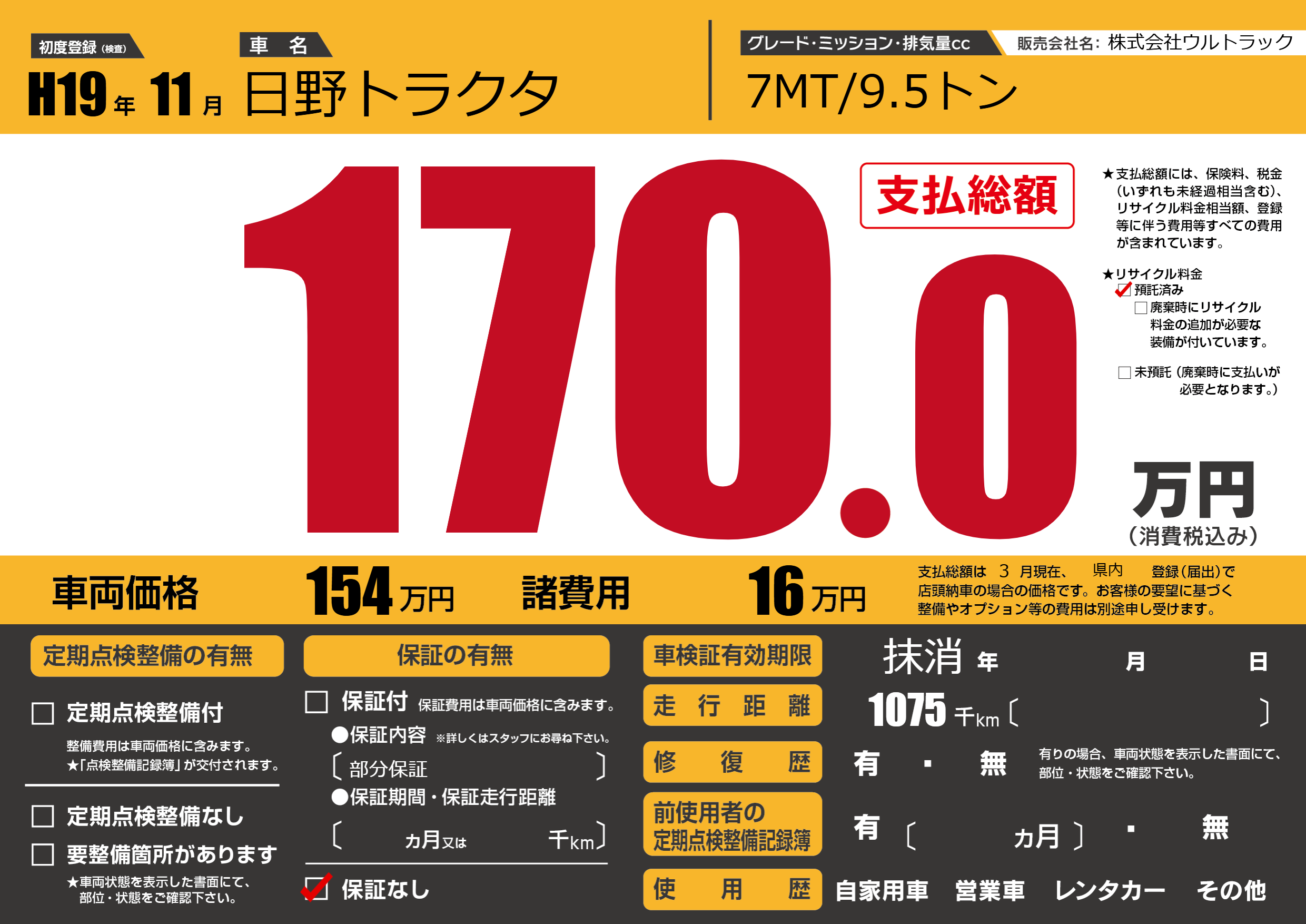 | 走行キロ | 107.5万km | 初年度登録 | H19年11月 |