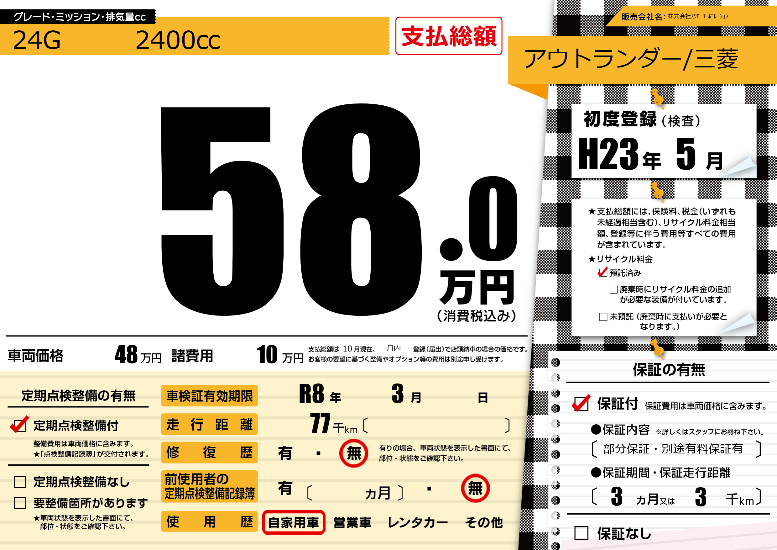 | 走行キロ | 7.7万km | 初年度登録 | H23年5月 |