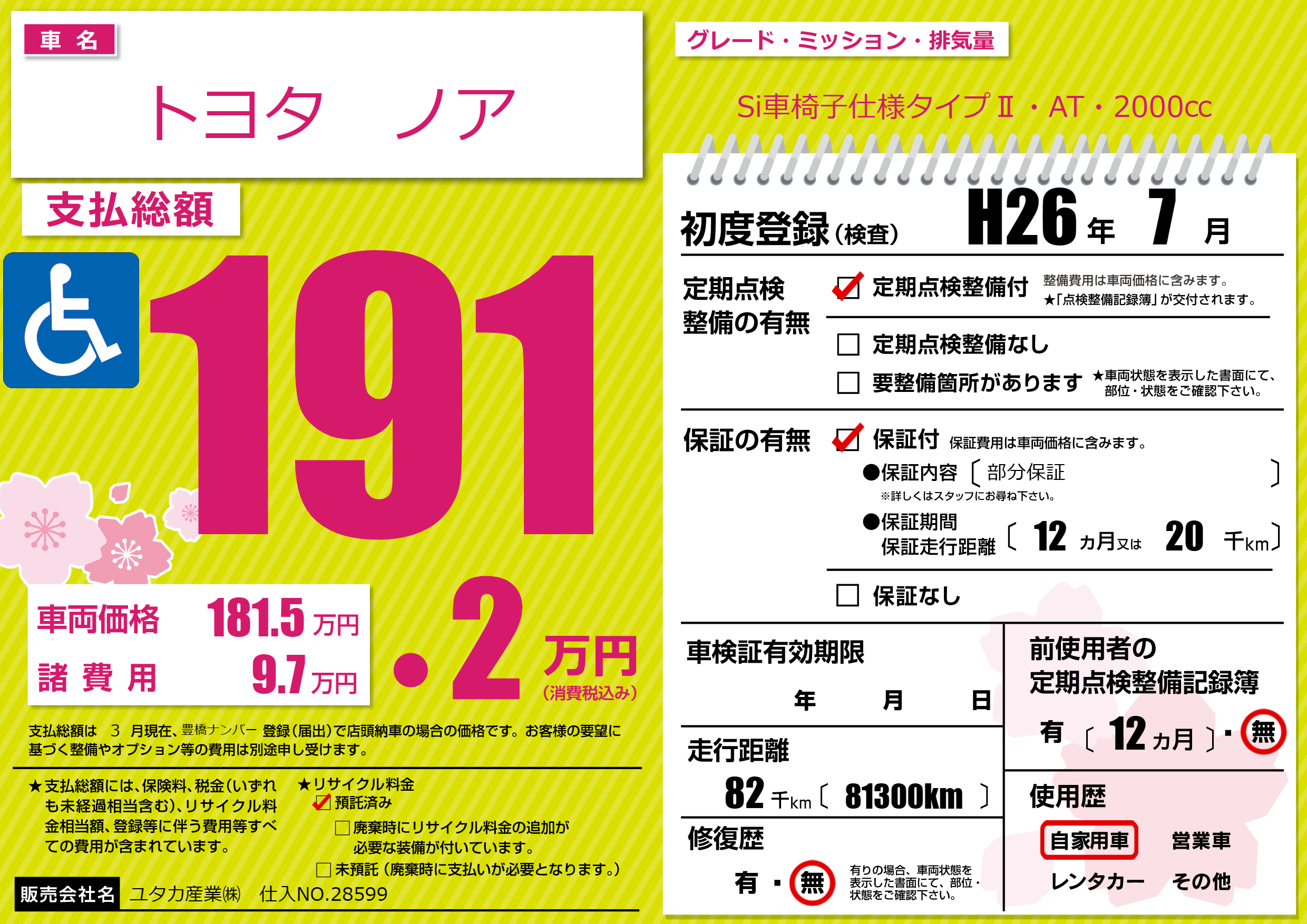 | 車名 | トヨタ ノア | グレード ミッション 排気量 |