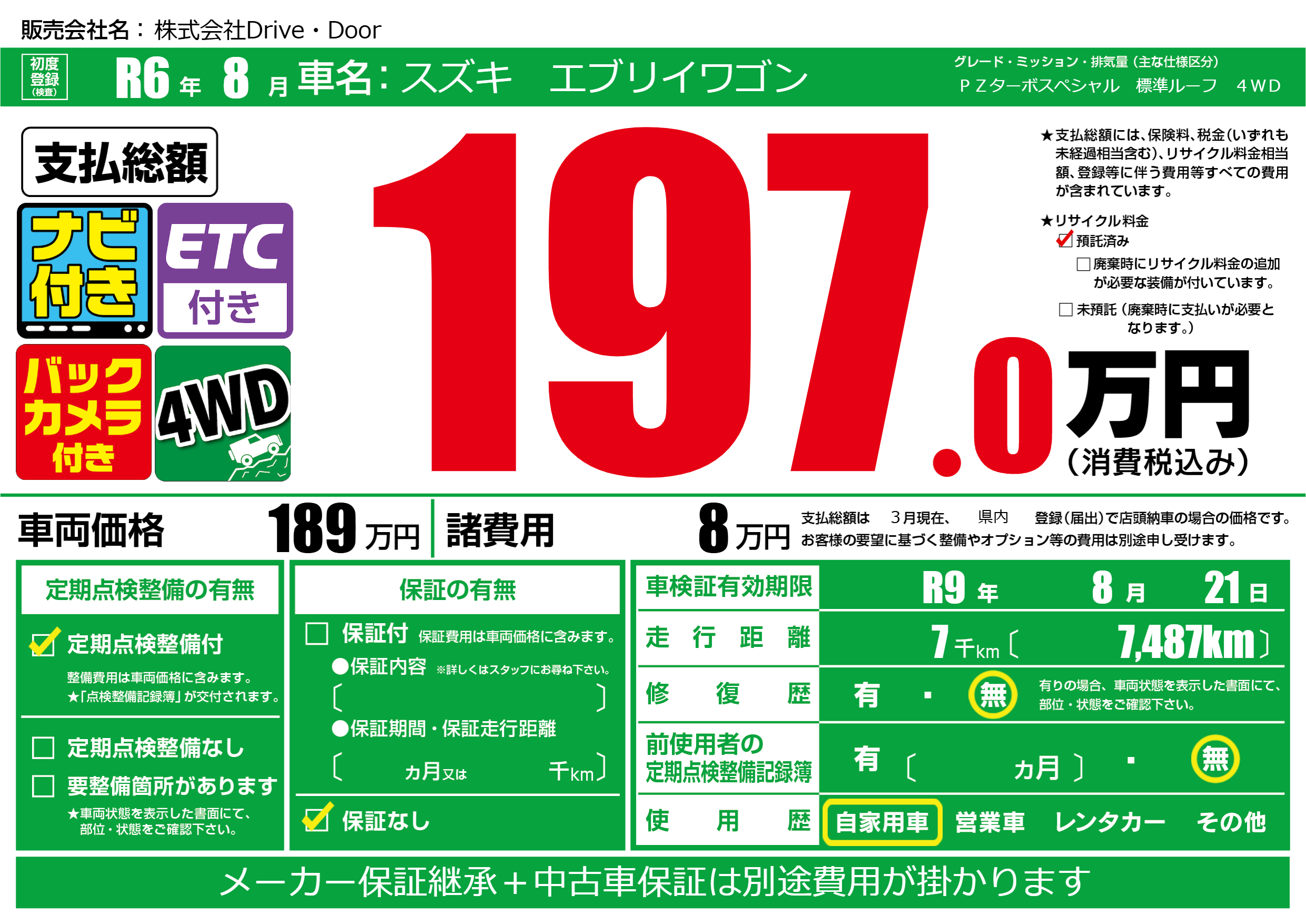| 走行キロ | 0.7万km | 初年度登録 | R6年8月 |