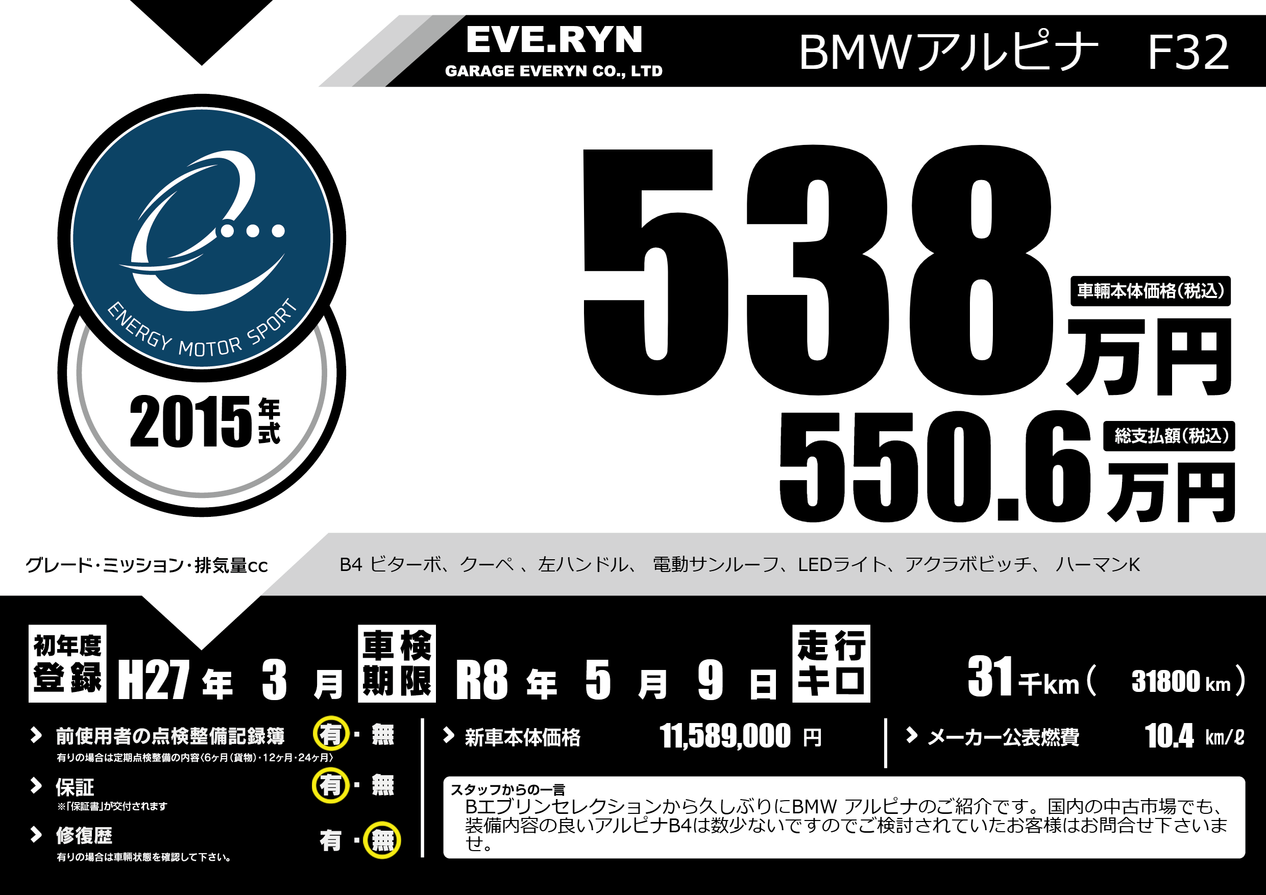 | 車名 | BMWアルピナ F32 | グレード ミッション 排気量 |