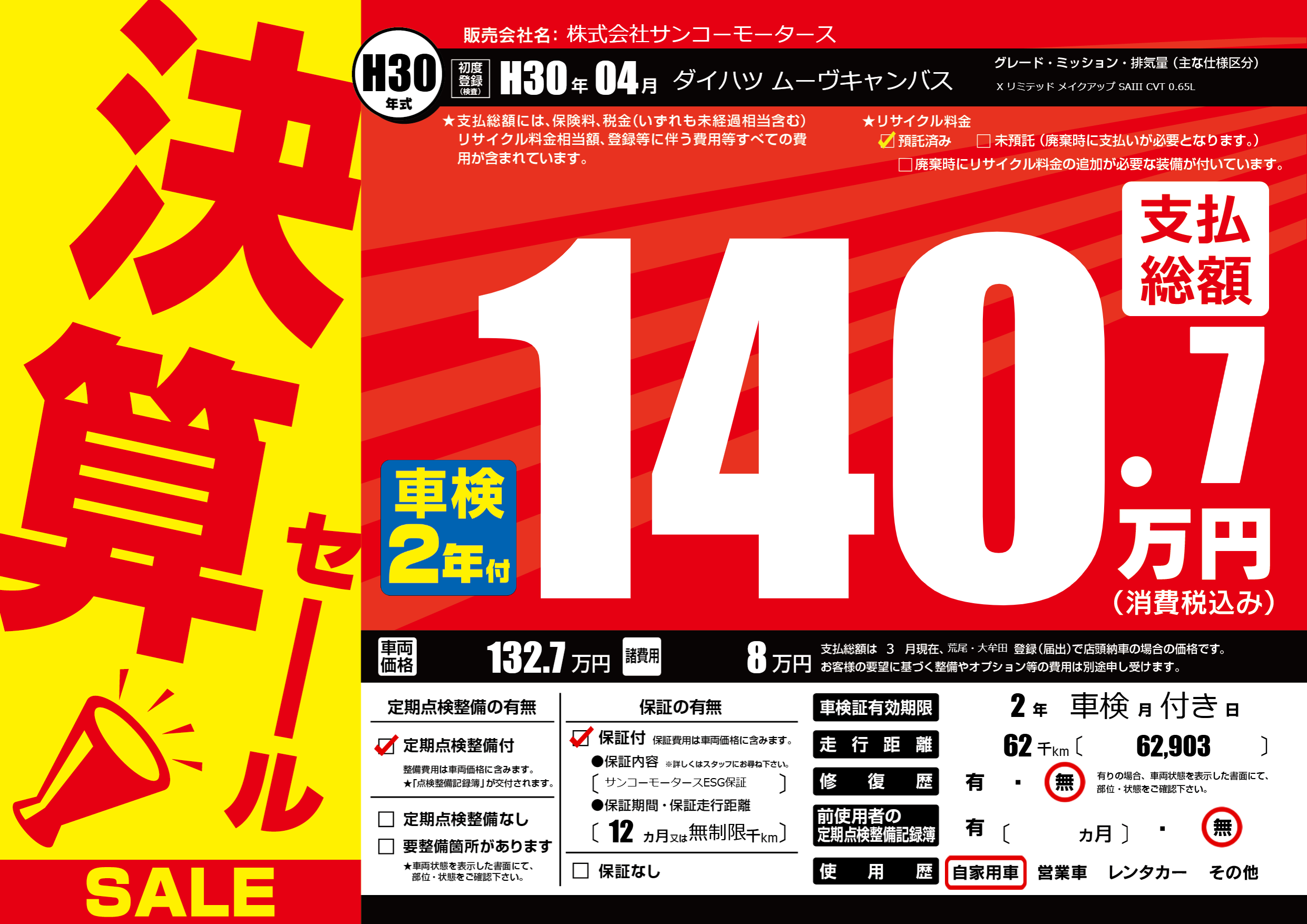 保証付き 保証内容(サンコーモータースESG保証) 12ヶ月または無制限千km |