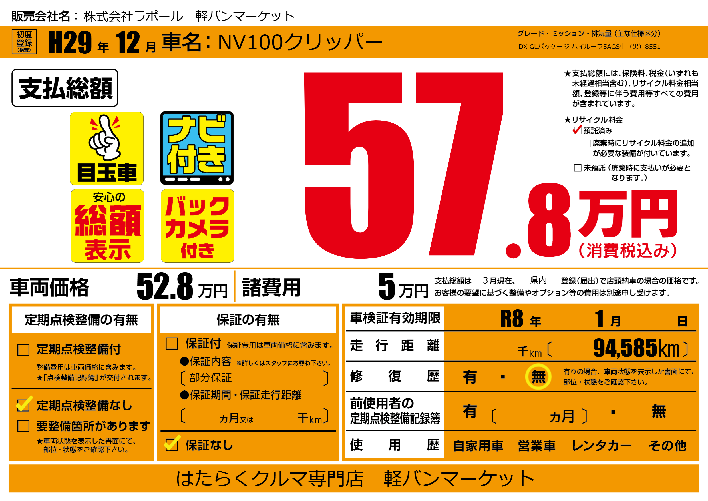 | 車検制限 | R8年 1月 - 日 | ||