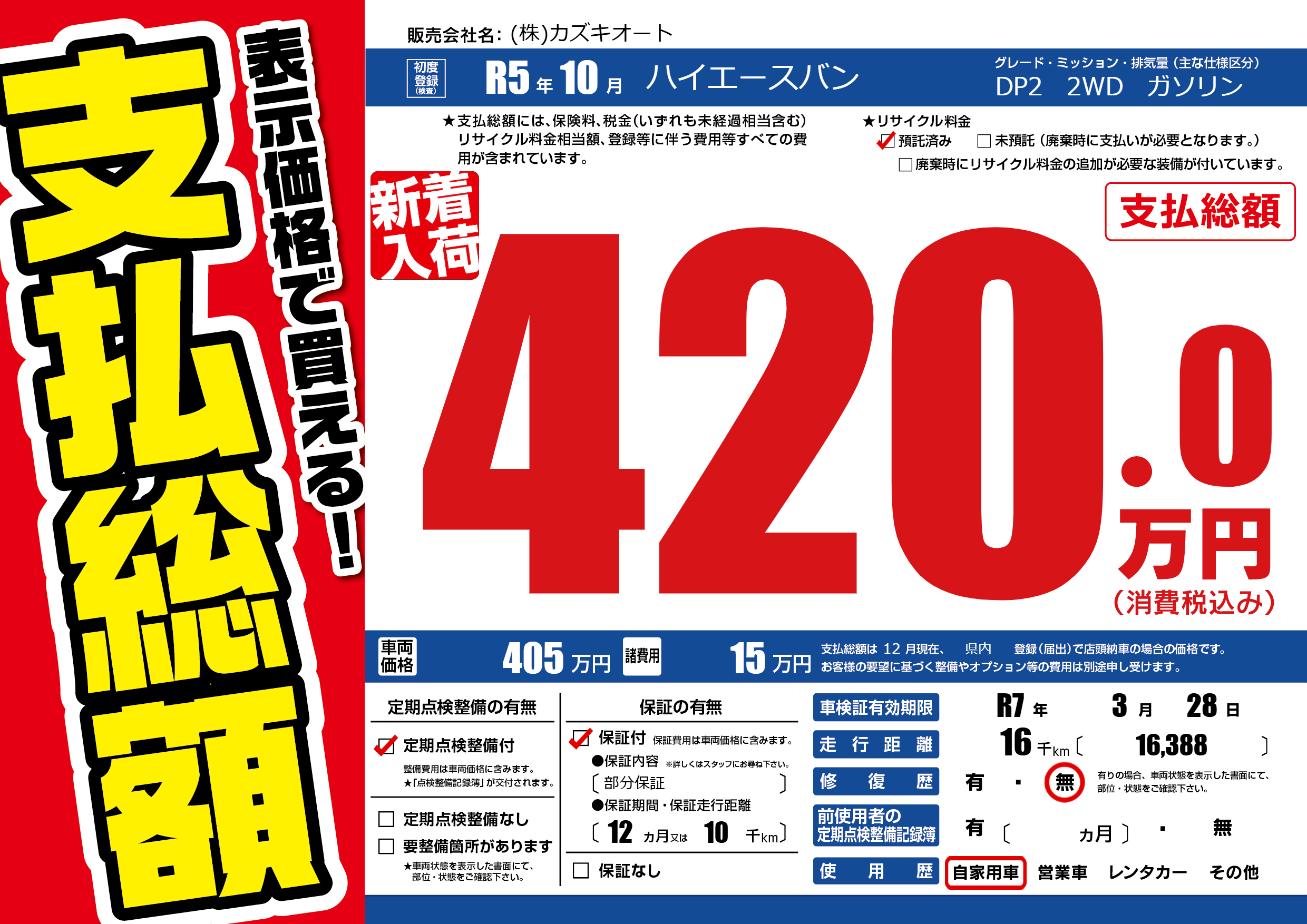 | 車名 | ハイエースバン | グレード ミッション 排気量 |