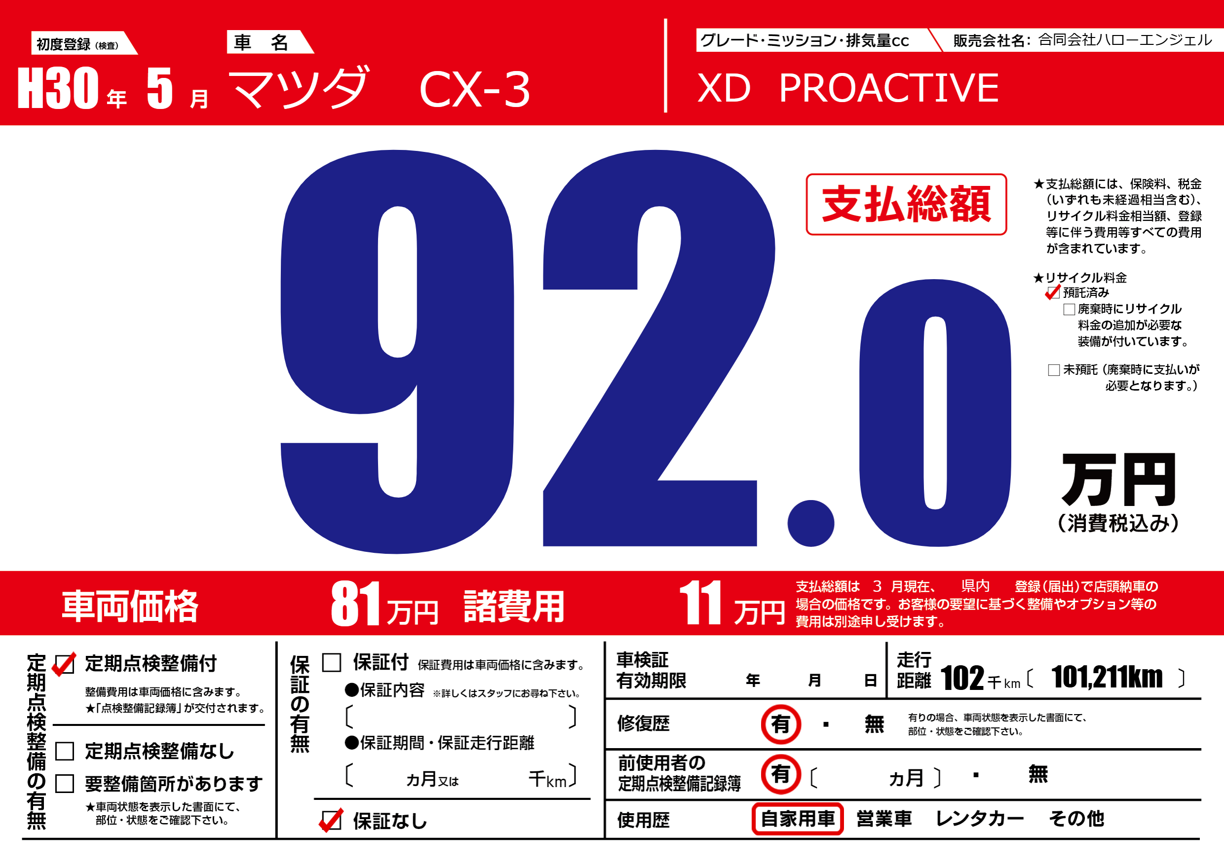 | 車名 | マツダ CX-3 | グレード ミッション 排気量 |