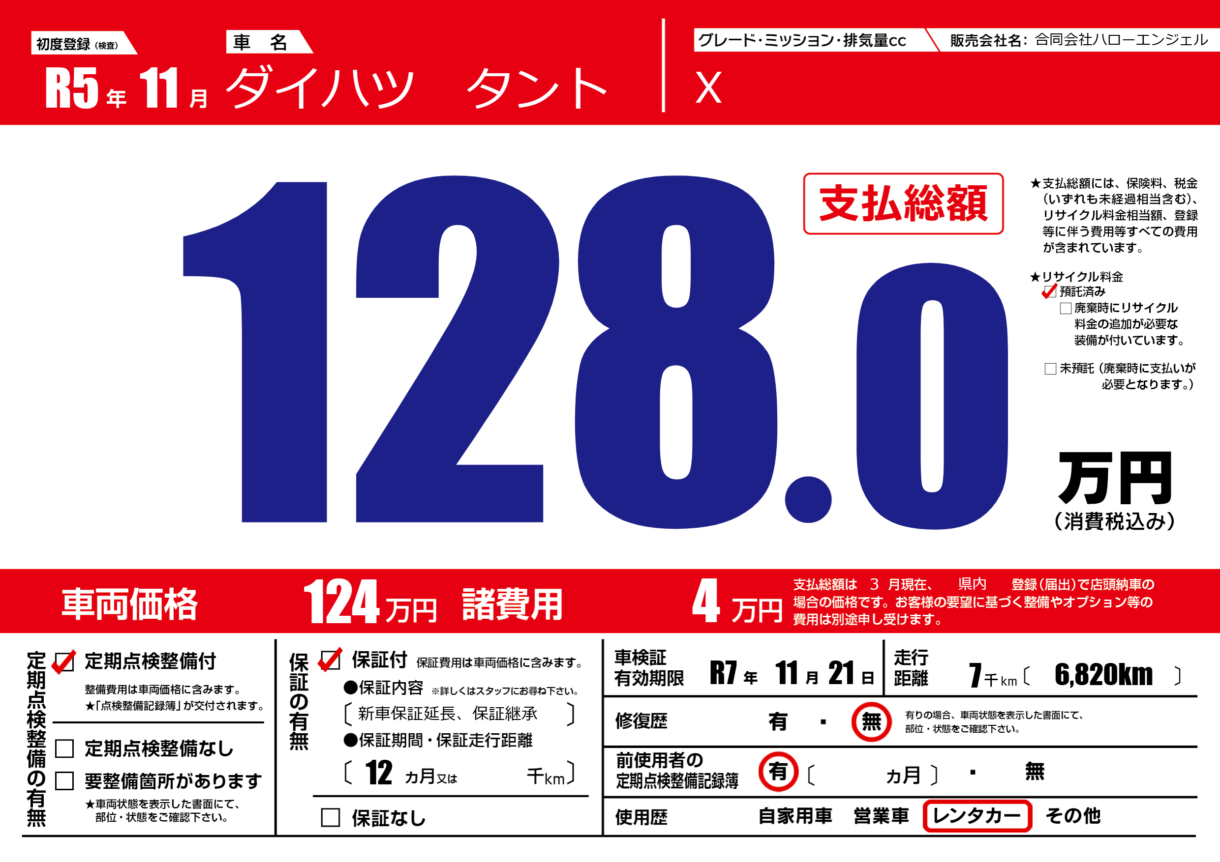 | 車検制限 | R7年 11月 21日 | ||