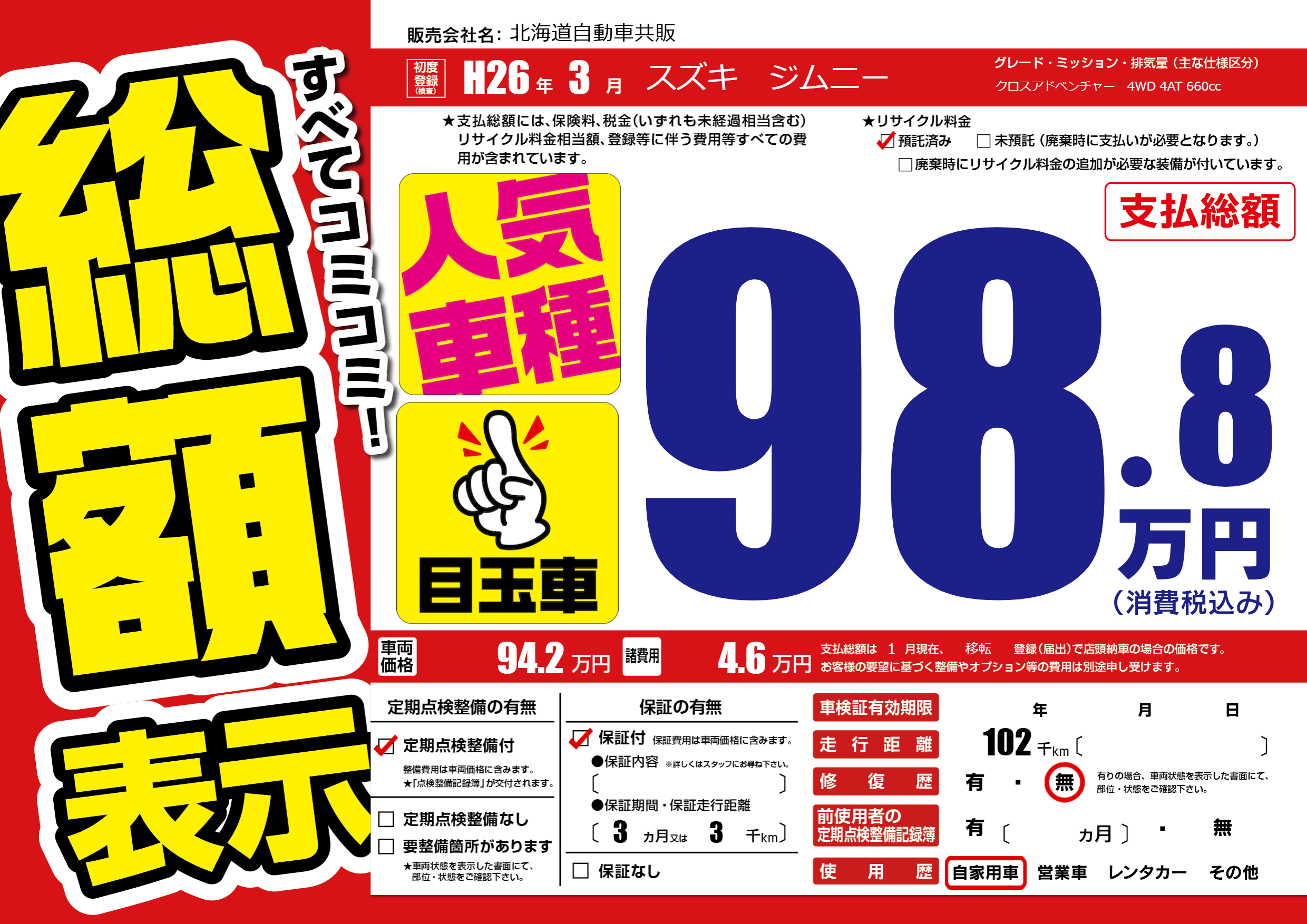 | 走行キロ | 10.2万km | 初年度登録 | H26年3月 |