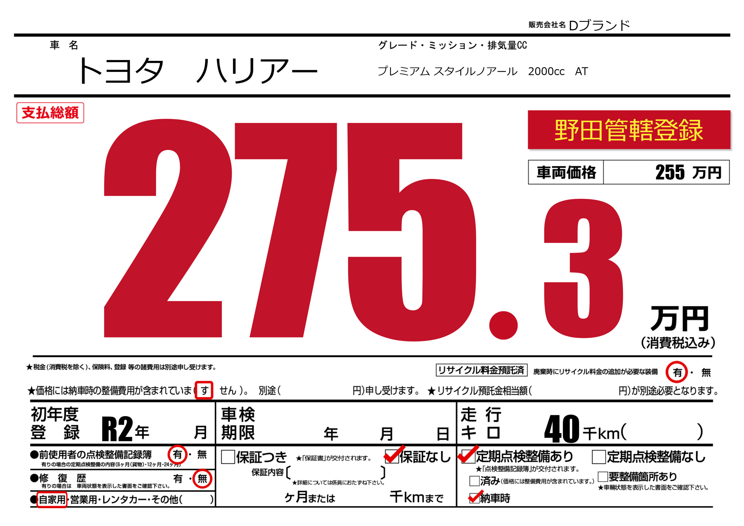 | 定期点検整備 | 定期点検整備あり 納車時あり | ||