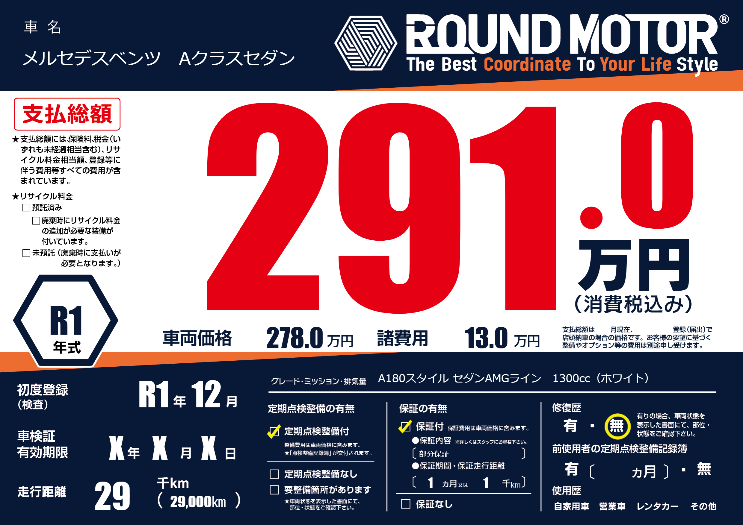 | 車名 | メルセデスベンツ Aクラスセダン | グレード ミッション 排気量 |
