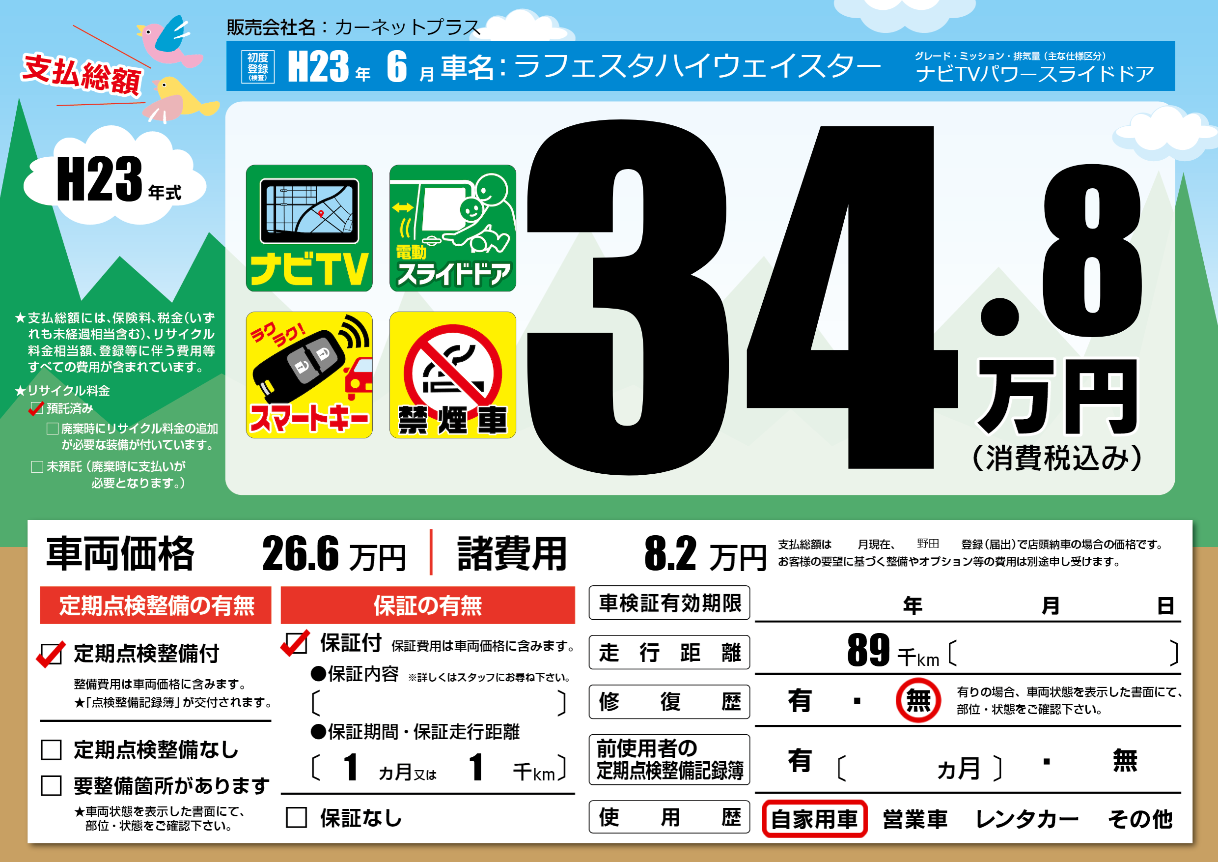 | 走行キロ | 8.9万km | 初年度登録 | H23年6月 |