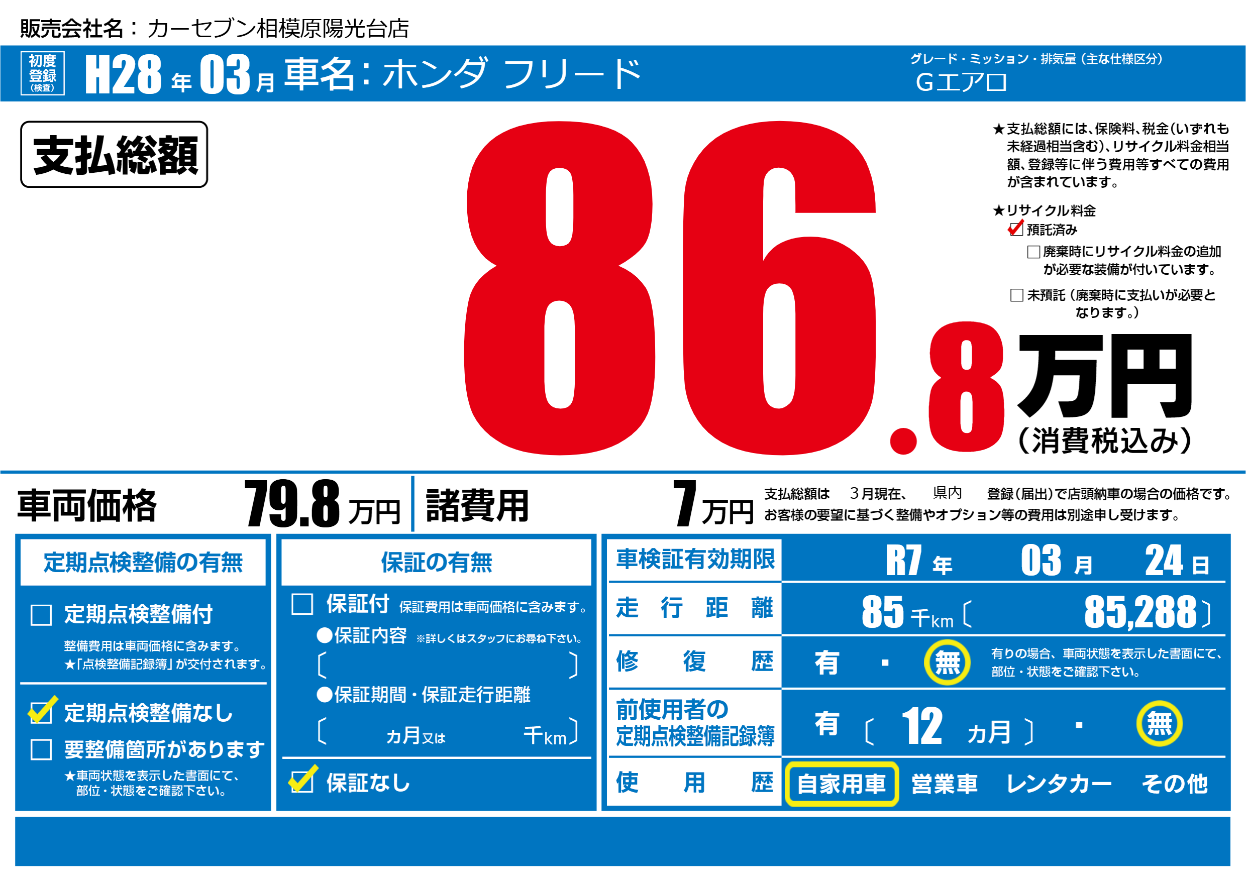 | 車名 | ホンダ フリード | グレード ミッション 排気量 |