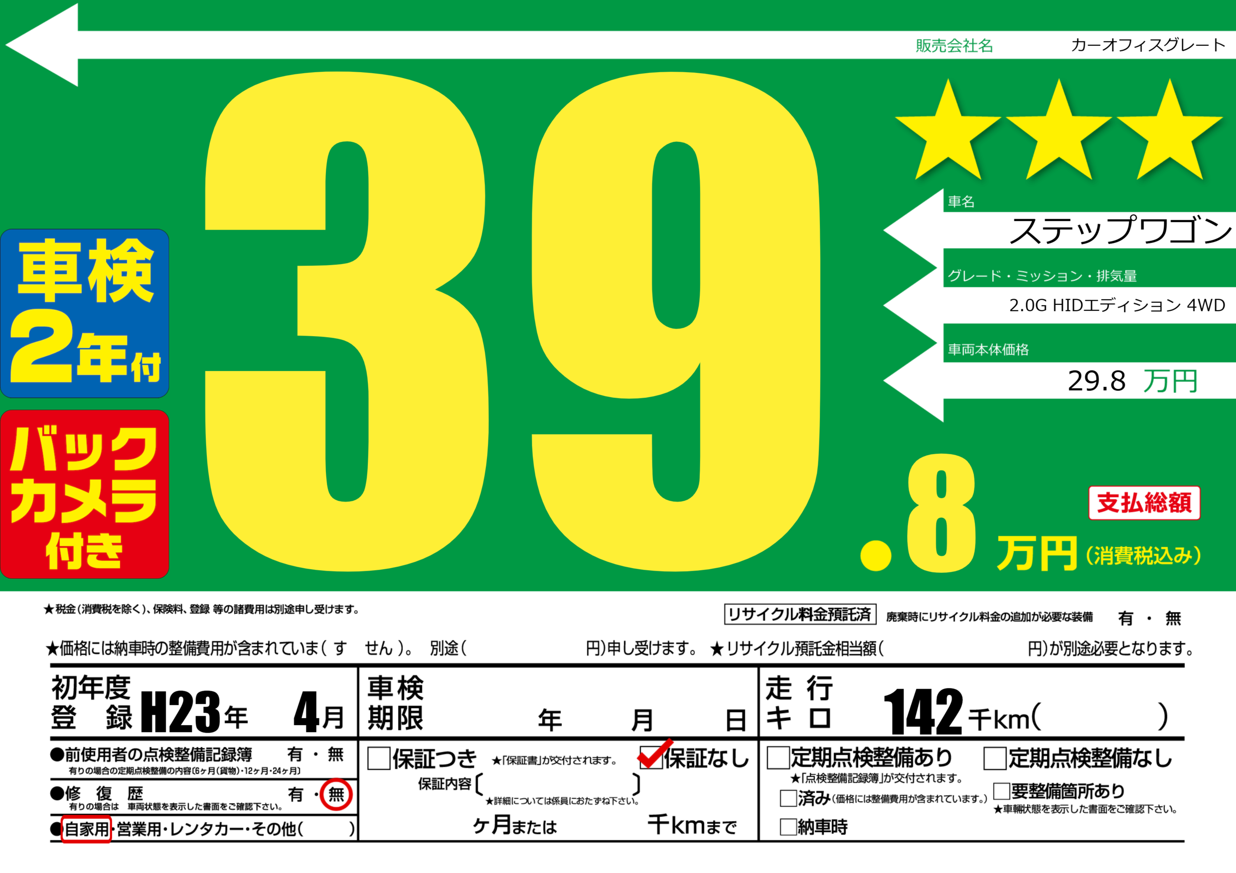 | 車名 | ステップワゴン | グレード ミッション 排気量 |
