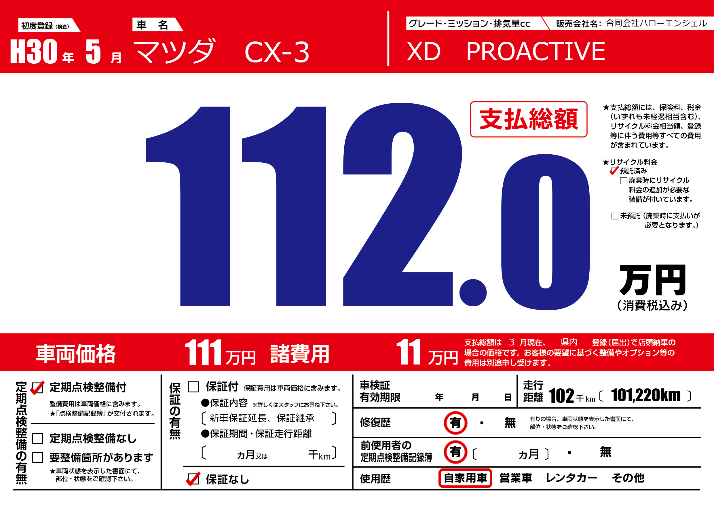 | 車名 | マツダ CX-3 | グレード ミッション 排気量 |