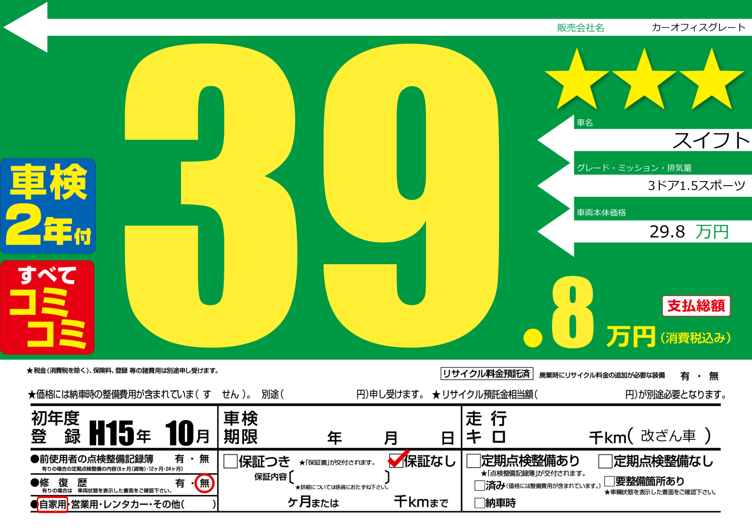 | 車名 | スイフト | グレード ミッション 排気量 |
