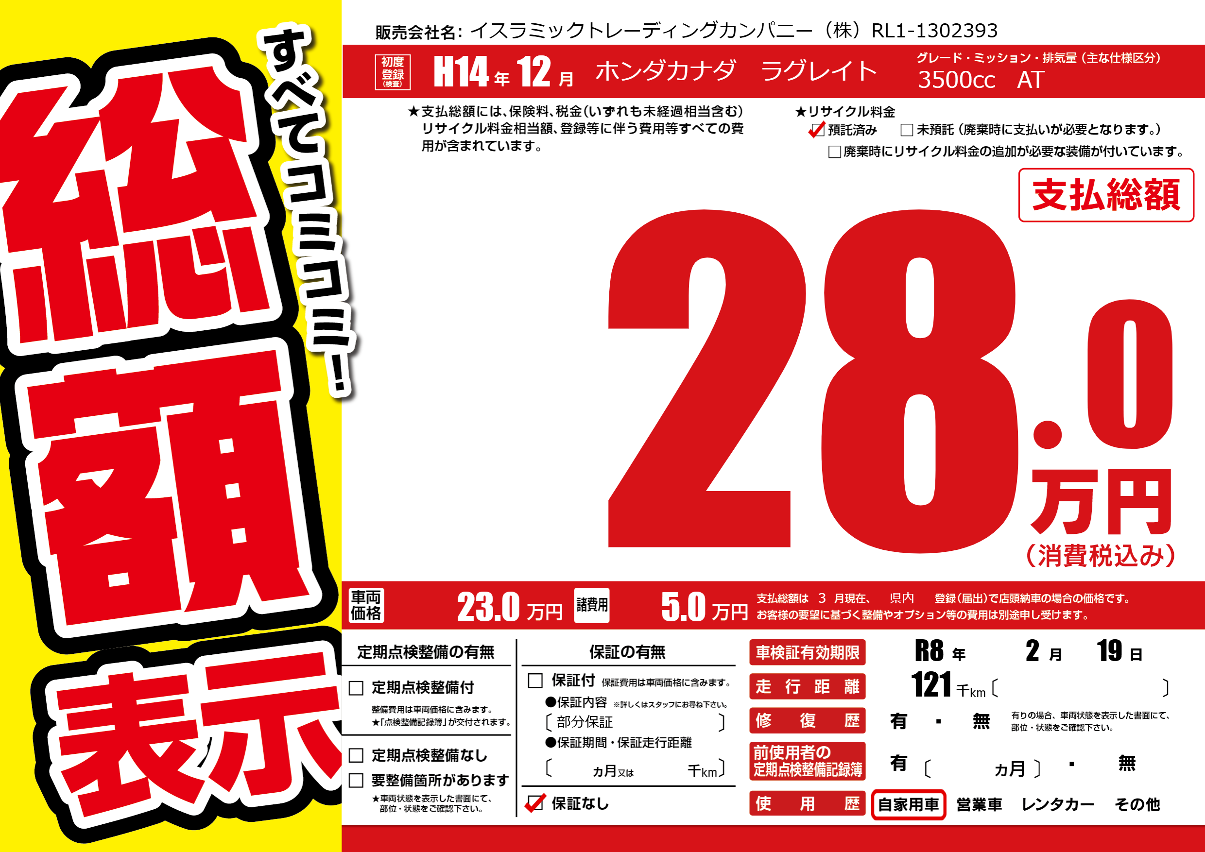 | 走行キロ | 12.1万km | 初年度登録 | H14年12月 |